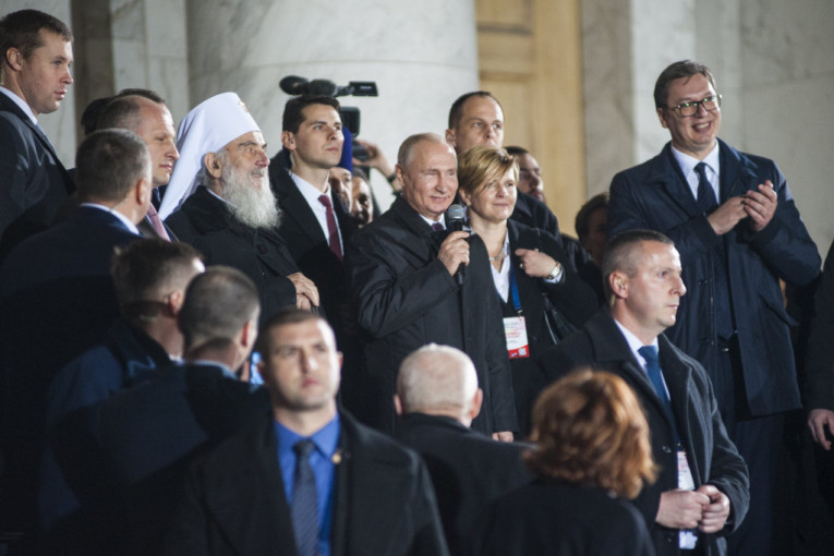 Foto: Tanjug/F. KRAINČANIĆPredvođena Jelenom Anasonović, devojkom koja zvanično potpisuje prijavu protestnih šetnji u policiji, grupa pristalica opozicije pokušala je u četvrtak da ušeta među građane koji su došli da pozdrave Putina i u masi razvije transparente "Stop krvavim košuljama" i "Nas je ipak više"... Srećom, policija ih je u tome sprečila, jer bi inače postojala realna opasnost da neko od okupljenih građana, a bilo ih je čak 125.000, reaguje, možda i napadne provokatore, i onda bi stvar lako izmakla kontroli.