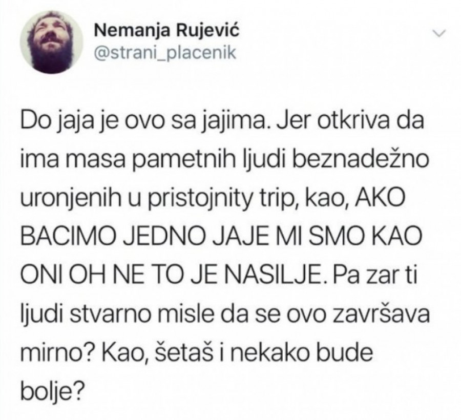 - Do jaja je ovo sa jajima. Jer otkriva da ima masa pametnih ljudi beznadežno uronjenih u pristojnity trip, kao, AKO BACIMO JEDNO JAJE MI SMO KAO ONI OH NE TO JE NASILJE. Pa zar ti ljudi stvarno misle da se ovo završava mirno? Kao, šetaš i nekako bude bolje? - piše "genijalni" Rujević.