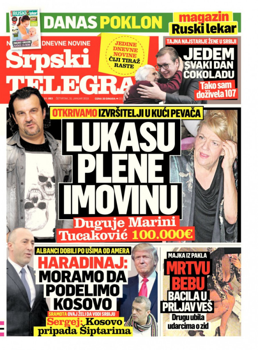O ovome, ali i o tome zašto pevaču Aci Lukasu plene imovinu, kao i o majci iz pakla koja je mrtvu bebu bacila u prljav veš, čitajte u sutrašnjem izdanju "Srpskog telegrafa" i na portalu "Republika".