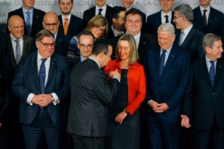 Naime, tokom priprema za grupno fotografisanje Visoka predstavnica EU za spoljne poslove i bezbednost pozvala je Dačića da se fotografiše sa ostalim ministrima, što je naišlo na osmehe prisutnih.