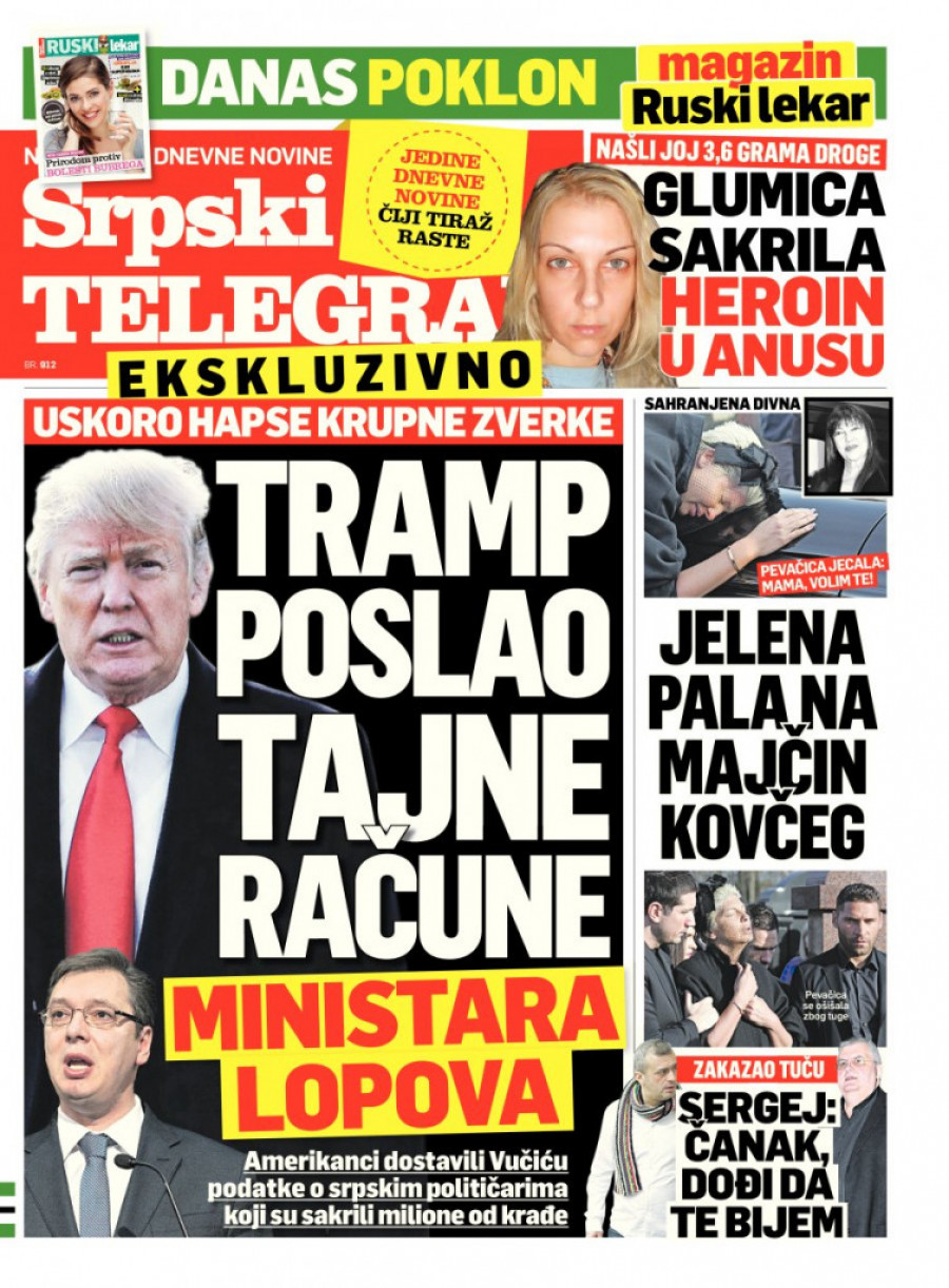 O ovome, ali i tome kako je Jelena Karleuša podnela majlinu sahranu, kao i tome gde je glumica optužena za ubistvo sakrila heroin, čitajte u sutrašnjem izdanju "Srpskog telegrafa" za 07.03.2019. godine.
