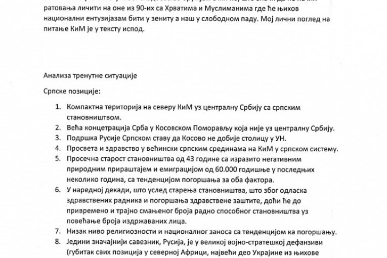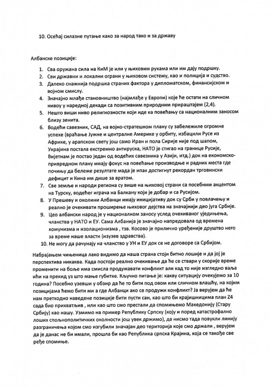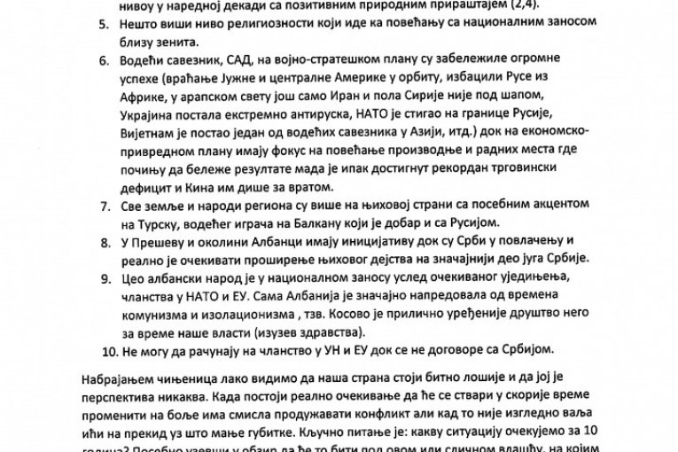 - Na poslednjem predsedništvu smo, tvrdnjom dobrog dela članova, utvrdili da će rešavanje problema KiM u narednom periodu vrlo malo zavisiti od nas, šta god uradili, te shodno tome naša glavna preokupacija treba da bude kako politički/medijski da prođemo kroz tu priču neoštećeni - stoji na početku dokumenta.