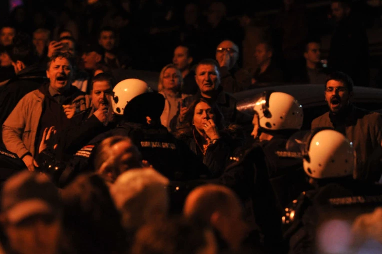 U zgradu RTS došla je i policija. Dok su pojedinci iz mase udarali policajce, oni nisu reagovali, već su samo ušli u zgradu.