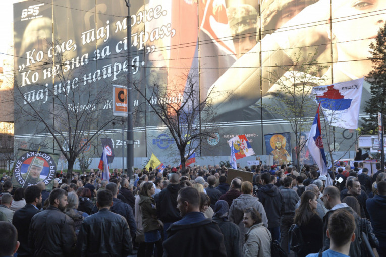 Foto: Tanjug/R. PRELIĆVikali su "Kosovo je srce Srbije" i nosili srpske zastave i transparente na kojima je pisalo "Nikad u NATO", "NATO, marš odavde", "Stop NATO fašizmu"...