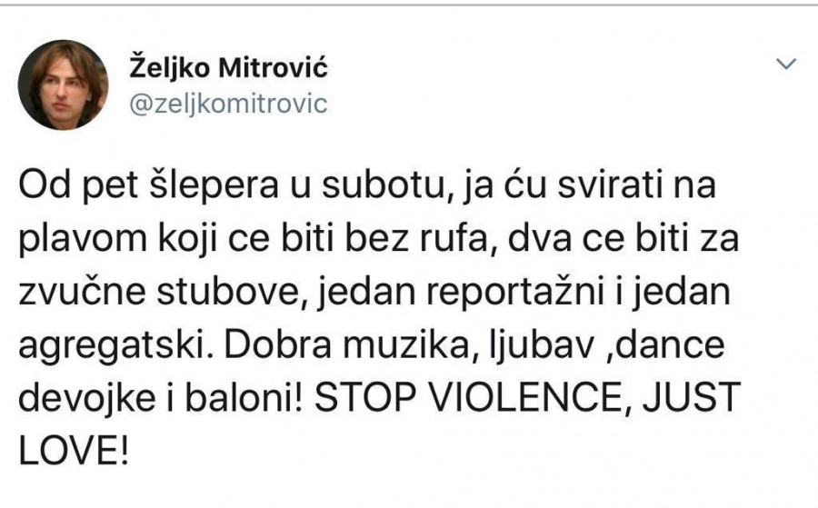 -Od per šlepera u subotu, ja ću svirati na plavom bez rufa, dva će biti za zvučne stubove, jedan reportažni i jedan agregatski. Dobra muzika, ljubav, dance, devojke i baloni! STOP VIOLENCE, JUST LOVE! - objavio je Mitrović na tviteru.