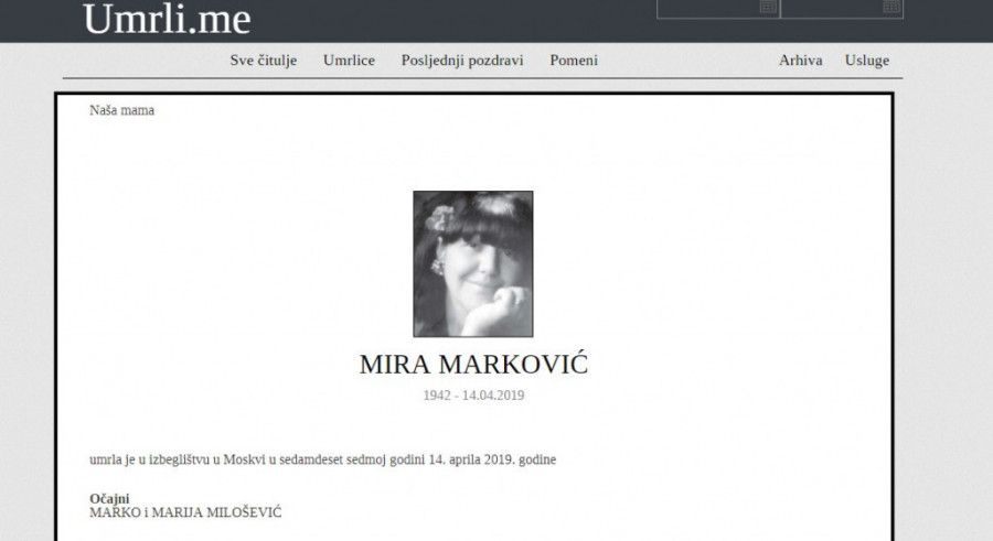 - Naša mama Mira Marković umrla je u izbeglištvu u Moskvi u 77. godini 14. aprila. Očajni Marko i Marija Milošević - piše u tekstu čitulje, prenosi RTCG.