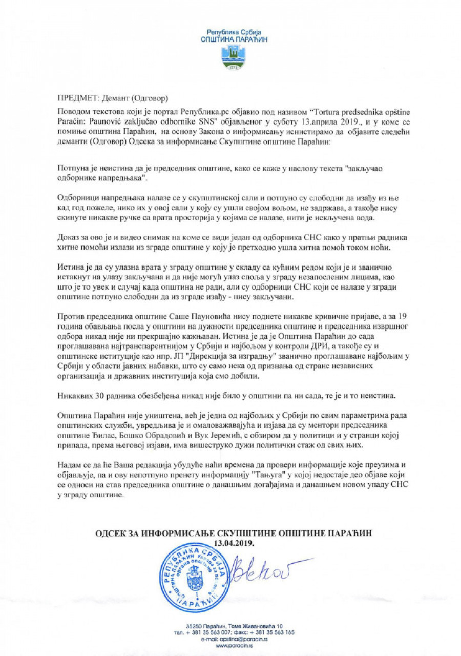 Povodom teksta "Tortura predsednika opštine Paraćin: Paunović zaključao odbornike SNS", objavljenog u subotu 13. aprila, u našu redakciju stigao je demanti (odgovor) Odseka za informisanja Skupštine opštine Paraćin.