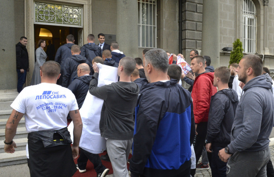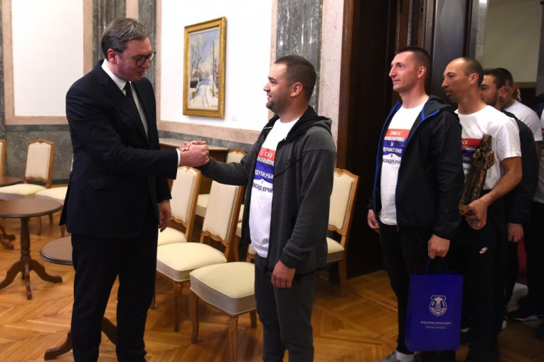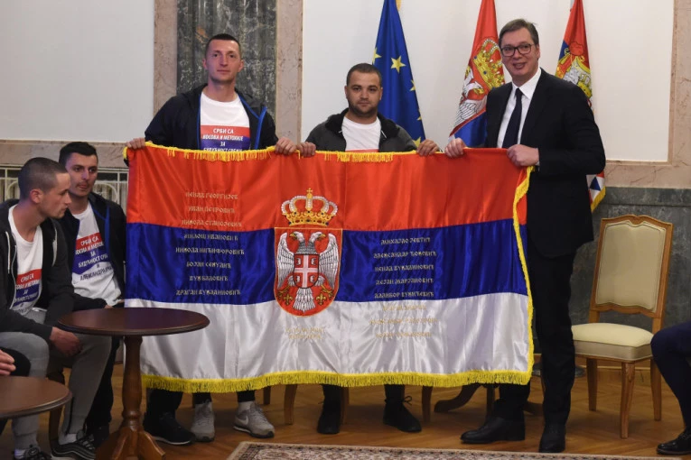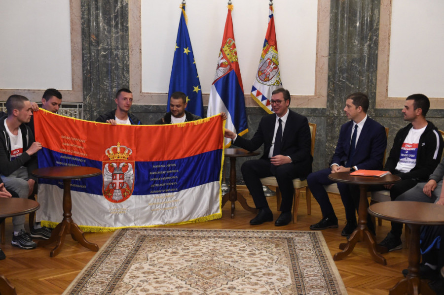 Foto: Tanjug/D. KUJUNDŽIĆVučić ih je primio u Predsedništvu, gde su došli sa transparentom, koji su nosili tokom celog puta, sa natpisom: "Srbi sa KiM za Srbiju i Vučića".
