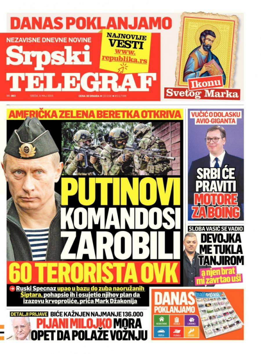 O svemu ovome, ali i o tome šta predsednik Aleksandar Vučić kaže o dolasku avio-giganta, kao i tome kako se pevač Sloba Vasić vadio što je digao ruku na devojku, čitajte u sutrašnjem izdanju "Srpskog telegrafa" za 08.05.2019. godine ili na portalu "Republika".