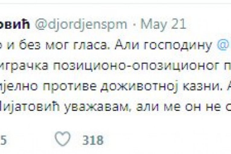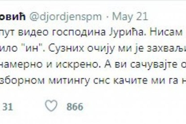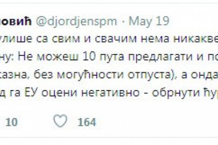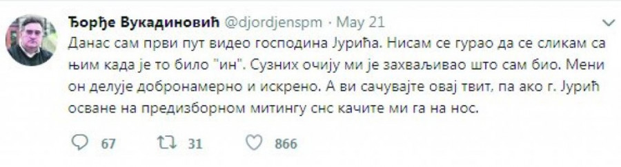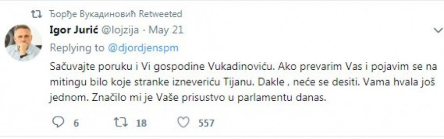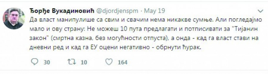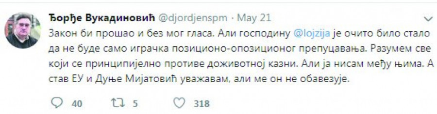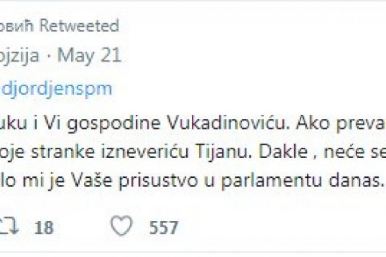 - Nikakav sporazum nisam prekršio jer ga nisam ni potpisao. Ispravnost svojih odluka ne merim brojem dobijenih lajkova. Čak i po tom kriterijumu na Tviteru sam dobio mnogo više pohvala nego kritika. Mislim da sam postupio ispravno i da bi bilo bolje da su i drugi opozicioni poslanici postupili tako - kaže Vukadinović.