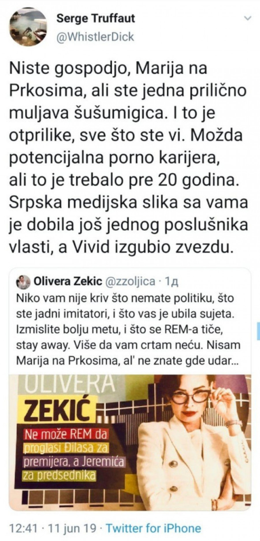 Lider Pokreta slobodnih građana Sergej Trifunović brutalno je izvređao na Tviteru članicu Saveta REM-a Oliveru Zekić rekavši da je "prilično muljava šušumigica" i da je za nju možda potencijalna porno karijera?!?