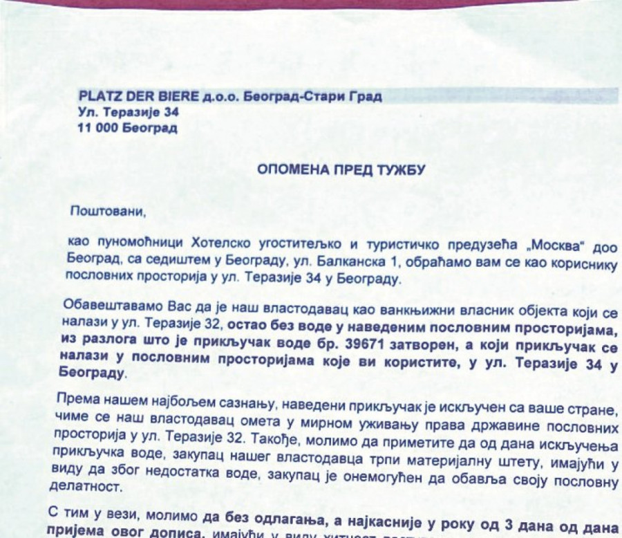 - Ista advokatska kancelarija traži da mi Dragiću i dalje isporučujemo vodu za džabe. Pritom, on se ne obavezuje da će platiti prethodni dug niti kaže da će ubuduće da plati vodu, a traži da ponovo omogućimo snabdevanje zgrade na Terazijama 32. Nama je nepoznato kada je Dragić bio zakupac i vlasnik, ali znamo da je koristio našu vodu. A ako se poziva na to da je bio zakupac, onda on nama i svim ostalim zakupcima prostora šalje poruku da ni mi ne bi trebalo da plaćamo vodu - kažu iz restorana "Kod dvoglavog orla", koji ovaj prostor zakupljuje od Zadužbine Krsmanovića.