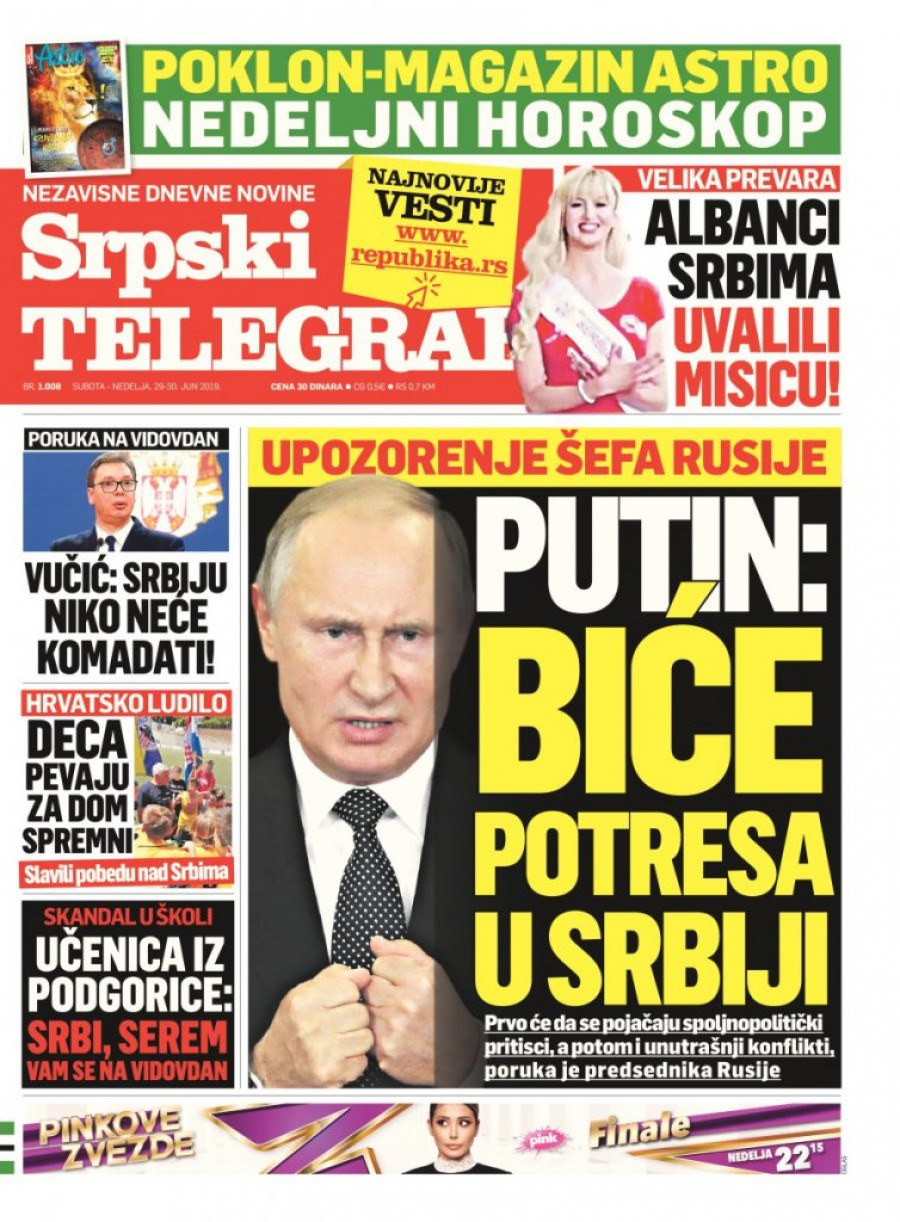 O svemi ovome, ali i o tome kakvu je poruku predsednik Vučić poslao na Vidovdan, kao i o tome koliko su deca iz okolnih zemalja zatrovana mržnjom prema Srbiji čitajte u sutrašnjemk izdanju "Srpskog telegrafa za 29.06.2019. godine ili na portalu "Republika".