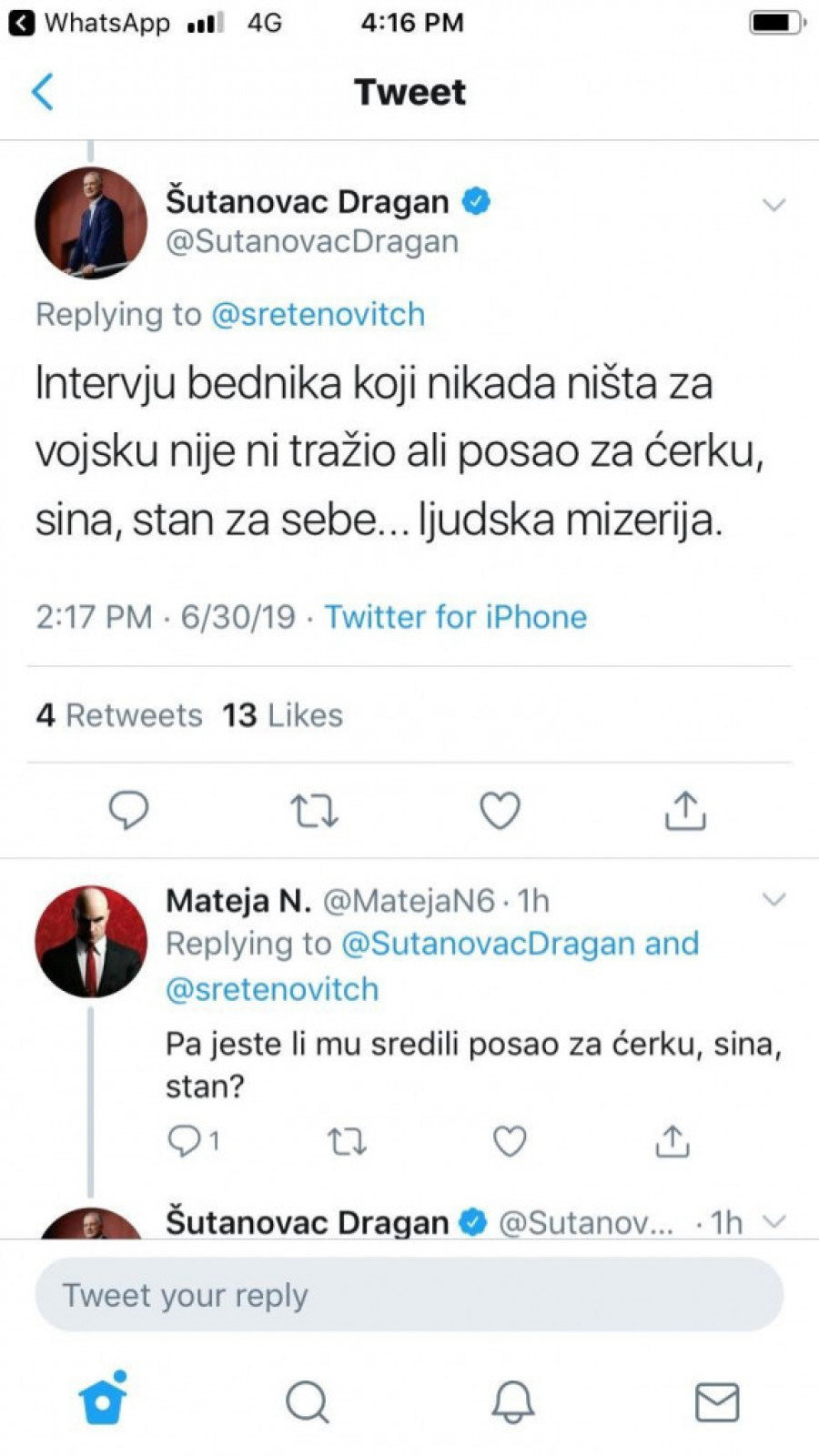 Foto: Tanjug/N. StojanovićNa svom tviter nalogu Dragan Šutanovac je na Dikovićev intervju reagovao na primitivan način: