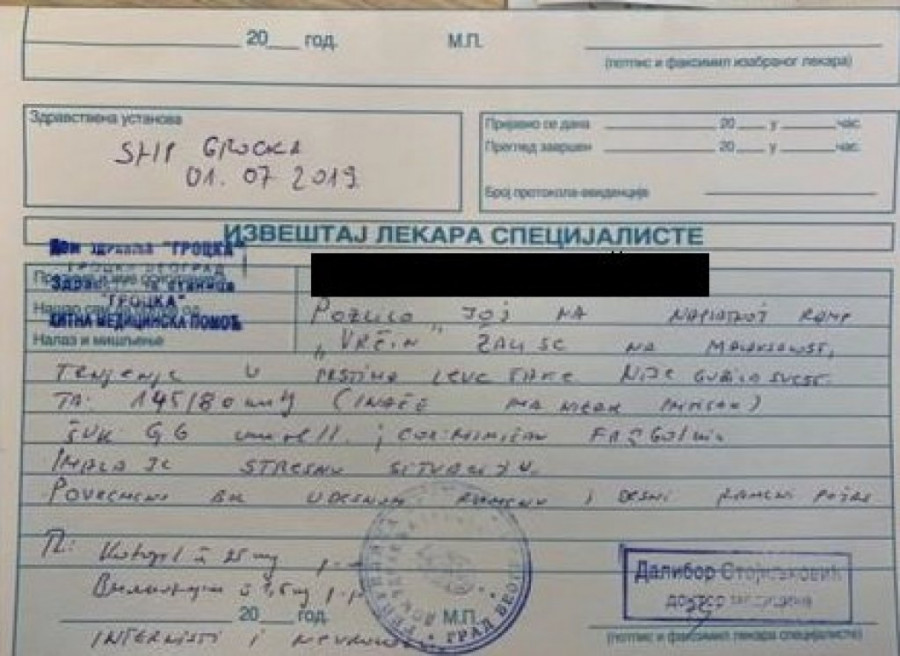 Srpski telegraf imao je uvid u lekarski nalaz u kojem se konstatuje da joj je pritisak 145/80, iako je inače izrazito nizak, da joj trnu prsti, a registrovani su i još neki simptomi. Zbog toga joj je propisana odgovarajuća terapija i upućena je na dalju opservaciju kod interniste i neurologa. |