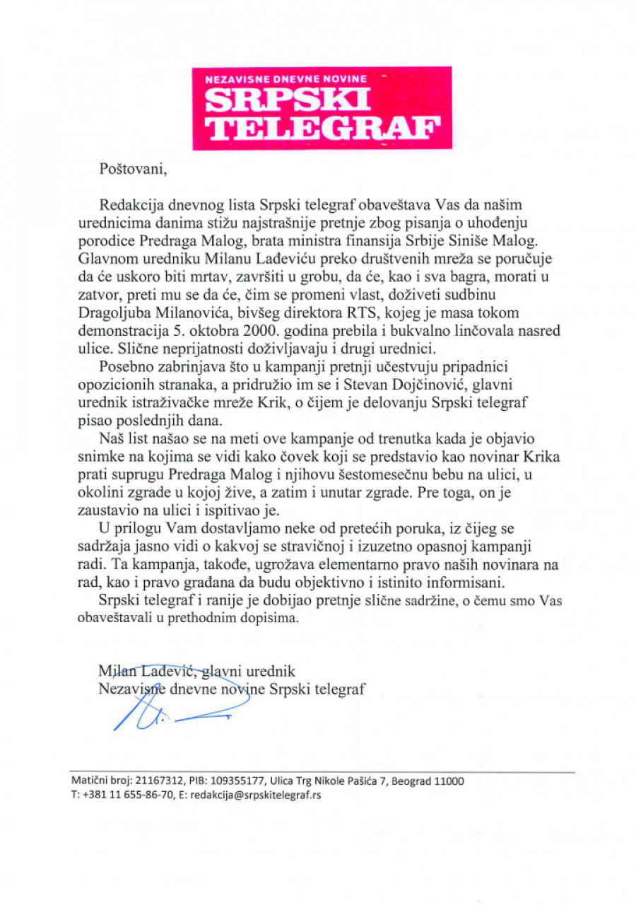 Pismo Srpskog telegrafa Foto: Srpski telegraf Foto: Srpski telegraf Foto: Srpski telegraf |