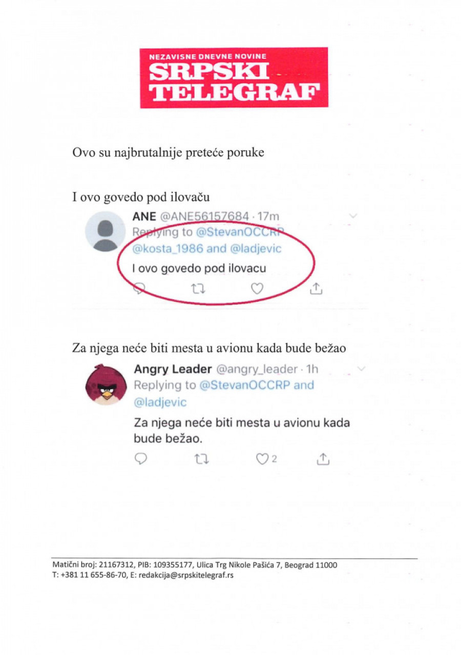 Ovo je bila samo jedna u nizu pretećih poruka upućenih Lađeviću i drugim urednicima našeg lista (pogledajte neke od tvitova koje smo pustili).