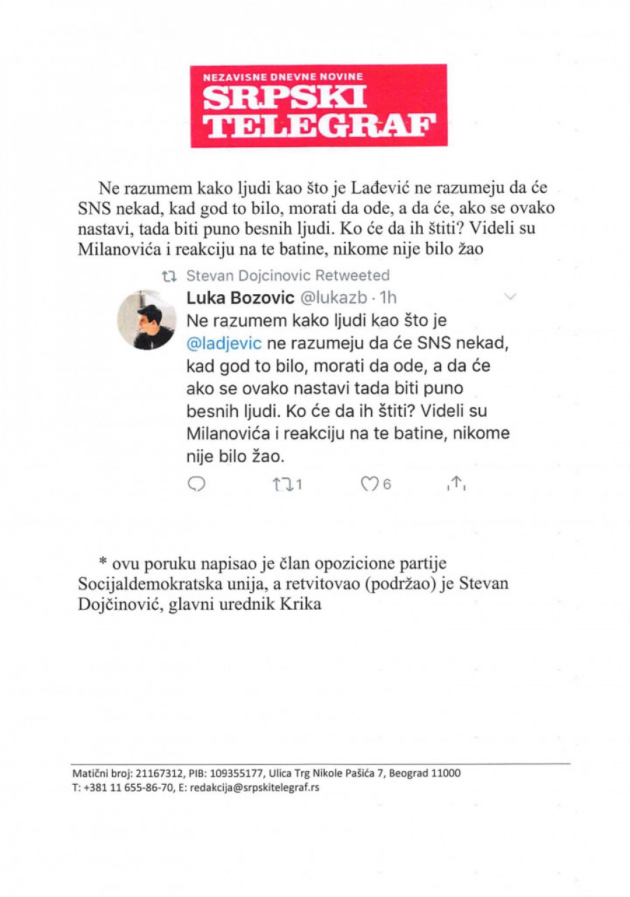 - Ne razumem kako ljudi kao što je Lađević ne razumeju da će SNS nekad, kad god to bilo, morati da ode, a da će ako se ovako nastavi, tada biti puno besnih ljudi. Ko će da ih štiti? Videli su Milanovića i reakciju na te batine, nikome nije bilo žao - napisao je na Tviteru Luka Božović, član partije Žarka Koraća (Socijaldemokratska unija), što je Dojčinović retvitovao i time otvoreno podržao.