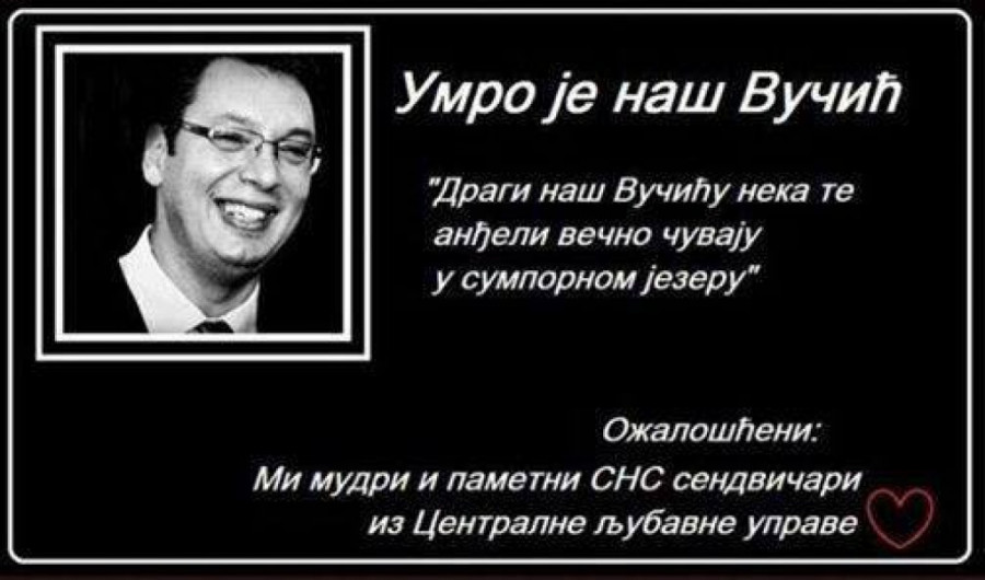 Foto: facebook.com/ Radoš Kraljevska Banja KoviljačaNajnovija morbidna pretnja Vučiću objavljena je na društvenoj mreži Fejsbuk. Korisnik sa imenom "Radoš Kraljevska Banja Koviljača", objavio je umrlicu sa likom Aleksandra Vučića na kojoj je napisao "Dragi naš Vučiću neka te anđeli večno čuvaju u sumpornom jezeru".