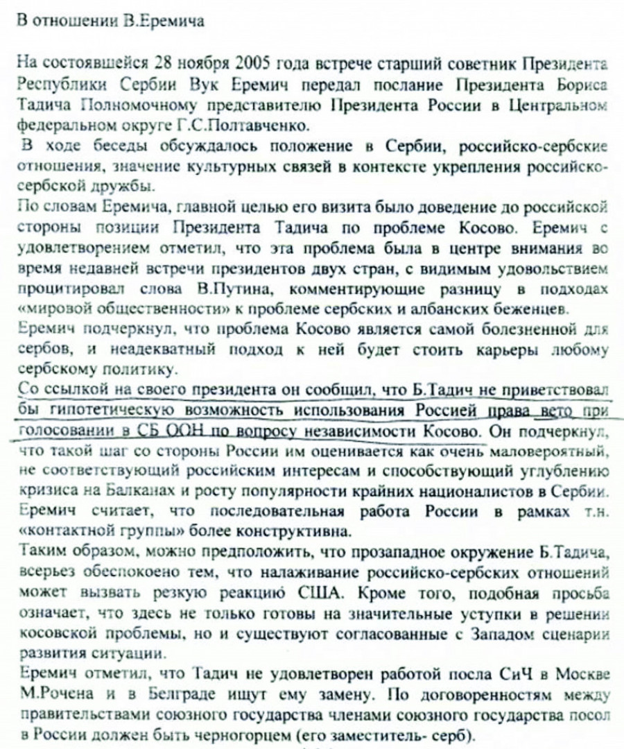 - Predao mu je pismo Tadića predsedniku Putinu i preneo usmenu poruku u vezi sa nekorišćenjem veta za rezoluciju o nezavisnosti Kosova. Navedeni tekst informacije dobio sam u administraciji predsednika Rusije da je prenesem predsedniku Tadiću radi provere onoga što sam dolaskom u Beograd 8. decembra 2005. godine i učinio - navodi naš sagovornik objašnjavajući kako je došao u posed dokumenta koji su napravile ruske službe.