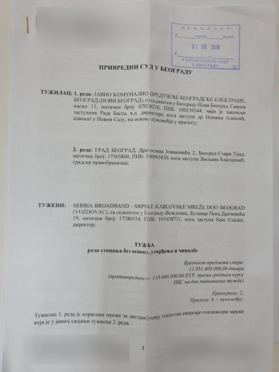 Javno komunalno preduzeće "Beogradske elektrane" i Grad Beograd su danas podneli tužbu protiv kablovskog operatera SBB.