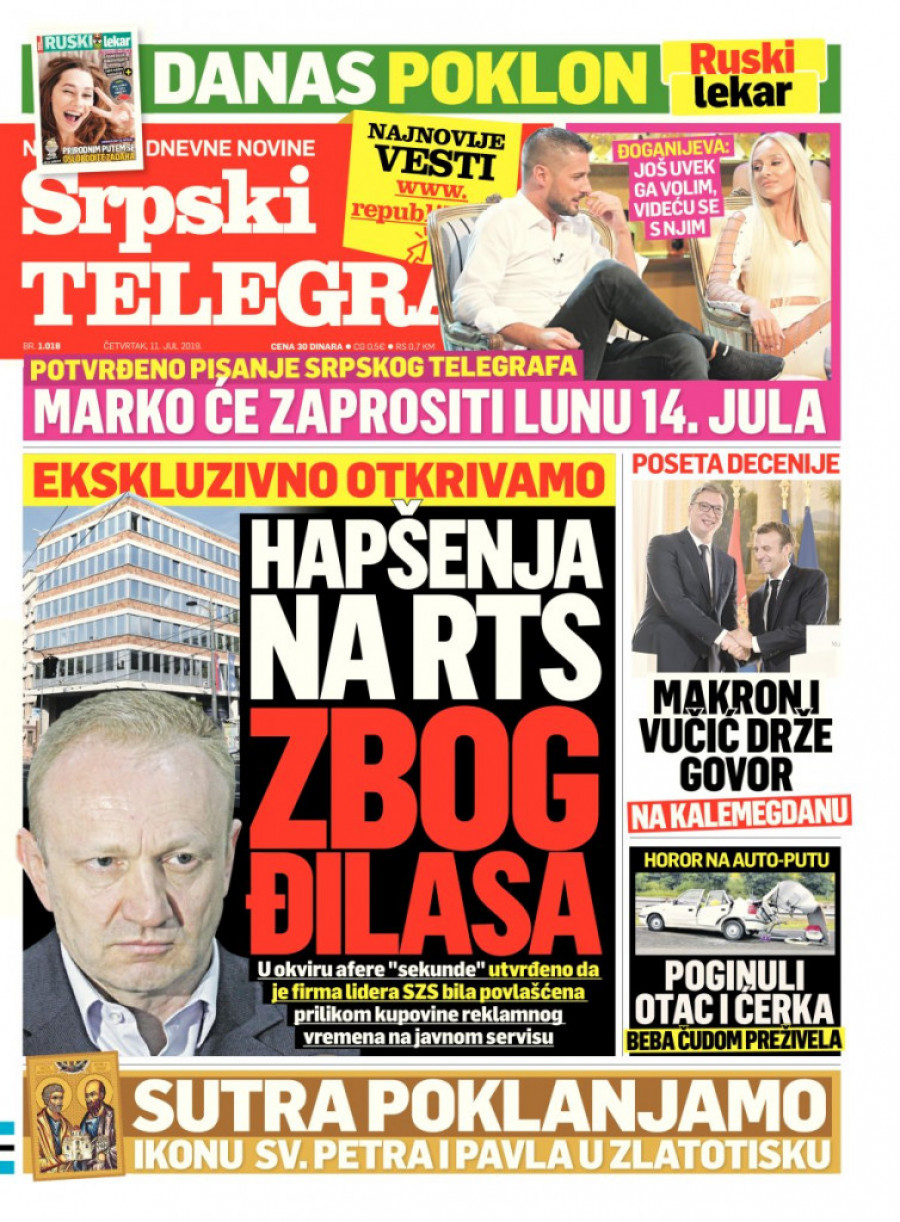 Srpski telegraf otkrio višegodišnju muljažu Foto: Srpski telegrafSrpski telegraf pisao je još 11. jula da je u okviru afere "sekunde" utvrđeno da je firma lidera Saveza za Srbiju bila povlašćena prilikom kupovine reklamnog vremena na javnom servisu. Evo kako se siromah Đilas bogatioNjegova firma "Multikom", baš kad je postao član DS 2004. godine, beleži astronomski rast prihoda 2005. - 3 miliona dinara 2006. - 4 milijarde dinara 2007. - 6 milijardi dinara 2008. - 7 milijardi dinara 2009. - 7 milijardi dinara 2010. - 7,8 milijardi dinara 2011. - 7,7 milijardi dinara Poslovanje "Dajrekt medije" višestruko je poboljšano u 2004, u vreme kada je Đilas bio direktor Narodne kancelarije. Kako je napredovao u funkcijama, tako su, sudeći po podacima, rasli prihodi njegove firme. 2001. - osnovana firma 2003. - 67 miliona dinara 2004. - 540 miliona dinara (Đilas direktor Narodne kancelarije) 2005. - 2,4 milijarde dinara 2006. - 4,4 milijarde dinara 2007. - 6,6 milijardi dinara (ministar za NIP) 2008. - 5,6 milijardi dinara (gradonačelnik) 2009. - 5,2 milijarde dinara 2010. - 5,8 milijardi dinara |