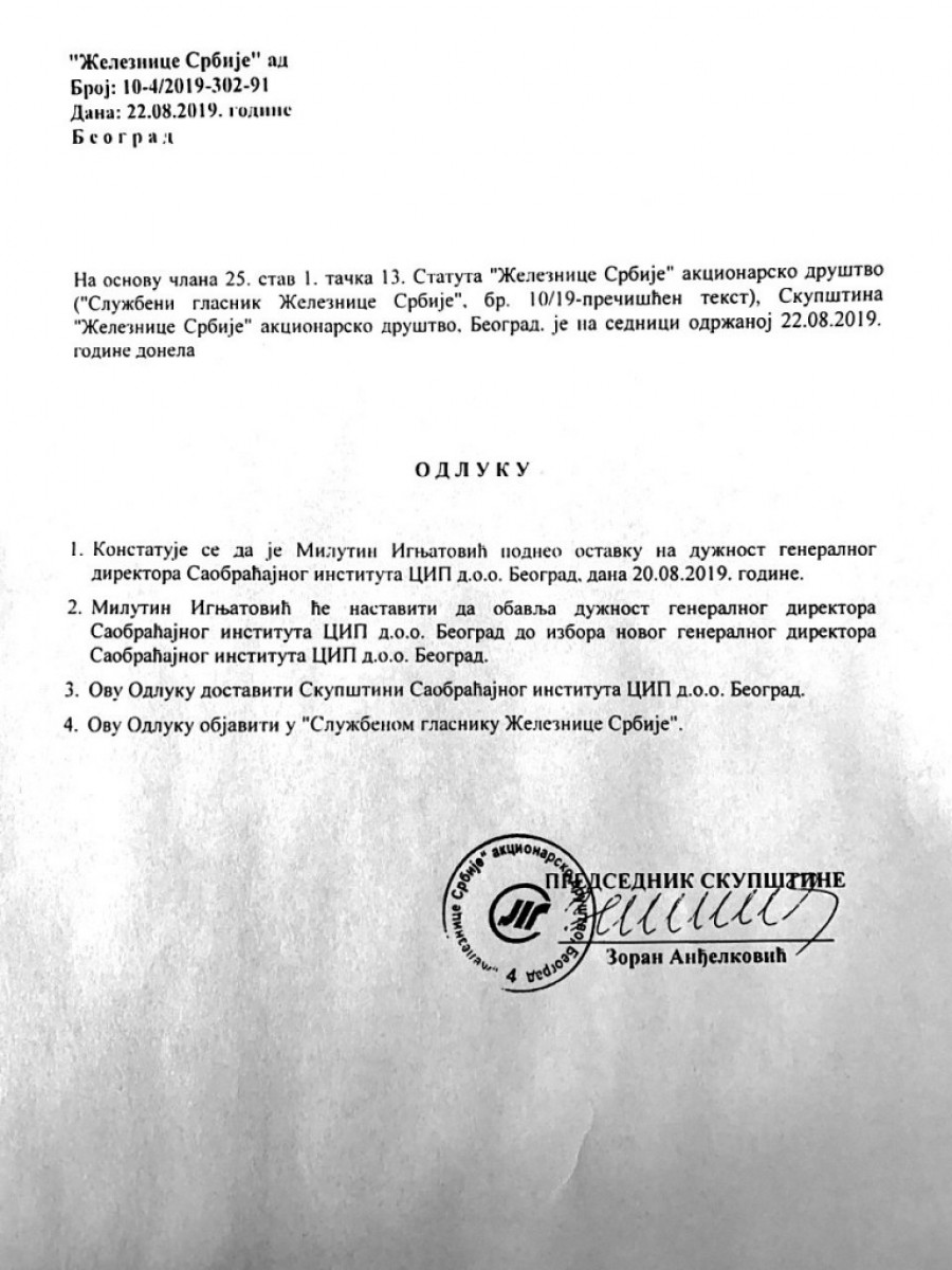 Foto: Tanjug/Z. ŽESTIĆPrema saznanjima Srpskog telegrafa koja smo već objavili, inženjer Ignjatović je 20. avgusta podneo ostavku na mesto generalnog direktora CIP, što je konstatovala i skupština tog saobraćajnog instituta na vanrednoj sednici održanoj dva dana kasnije. Ostavku je konstatovala i skupština preduzeća "Železnice Srbije" a. d.