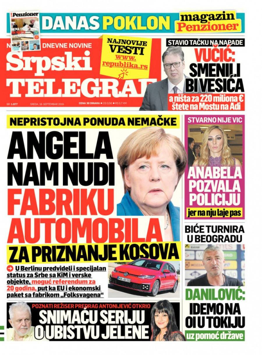 Kako nisko misljenje o srpskom narodu ima Merkelova. Fabrike automobila propadaju, EU raspada a ona nam to nudi da bi joj dali najbogatiji deo srpske zemlje. Mislim bas me razocara ova Angela, ja sam mislila da su nemci mudriji narod. Ne verujem da u srpskom narodu postoji neko bez mozga ko bi o tome uopste i raspredao. Bas ti hvala Angela sto mislis da smo mi narod bez mozga.
