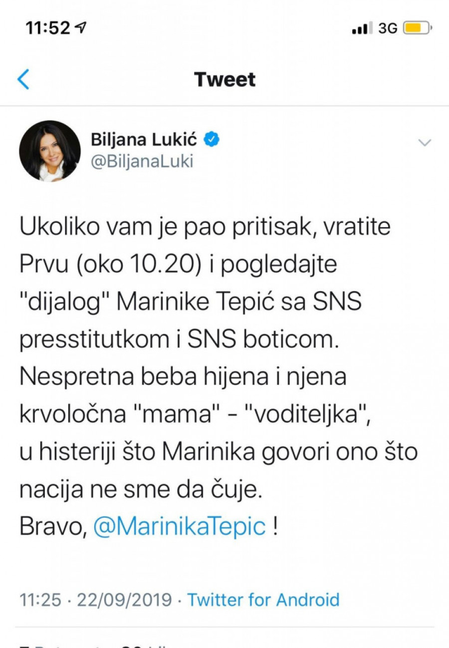 Promoterka Saveza za Srbiju Biljana Lukić nastavila je Đilasovu i Boškovu politiku vređanja zena. Sjajnu pravnicu nazvala prostitutkom, a voditeljku TV Prva krvoločnom hijenom.