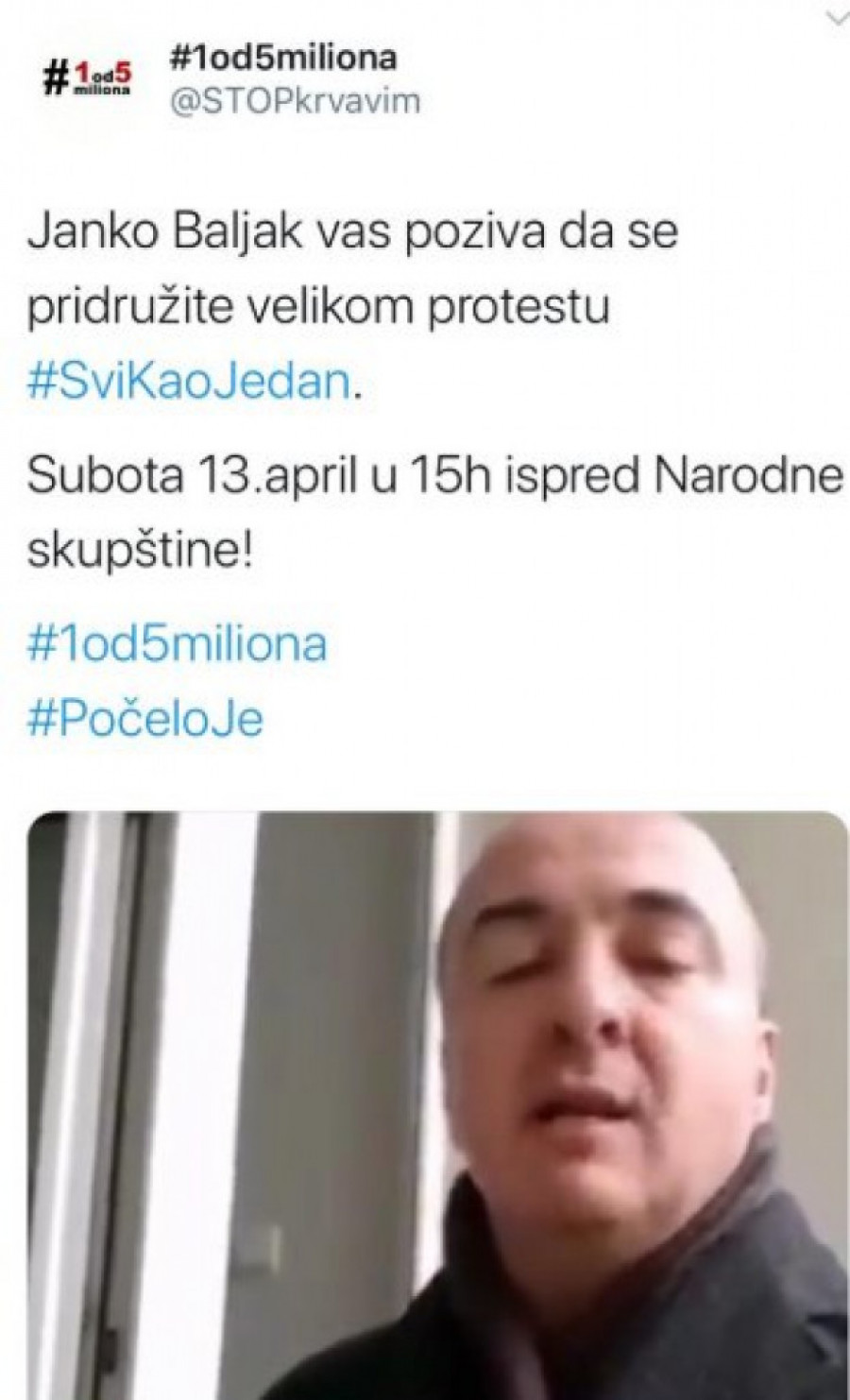 Inače, Baljak je vatreni zagovornik propalih protesta koje je organizovao Savez za Srbiju skrivajući se iza građana, što se jasno može videti i u seriji njegovih tvitova u kojima je jasno pozivao na demonstracije.