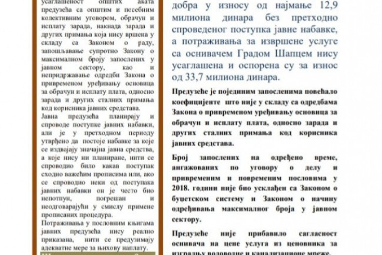 Državni revizor je utvrdio takođe da su poslovne knjige ovog “dosmanlijskog” javnog preduzeća u Šapcu – blago rečeno u haosu! Nema precizne evidencije naplate, niti potraživanja?! Očigledno, hoas u poslovnim knjigama imao je za cilj, da se sakriju svi oni koji ( verujemo) godinama ne plaćaju za pružene usluge… A, takvih je u Šapcu izgleda mnogo. I sve na štetu građana, kroz “naštelovane račune”:..