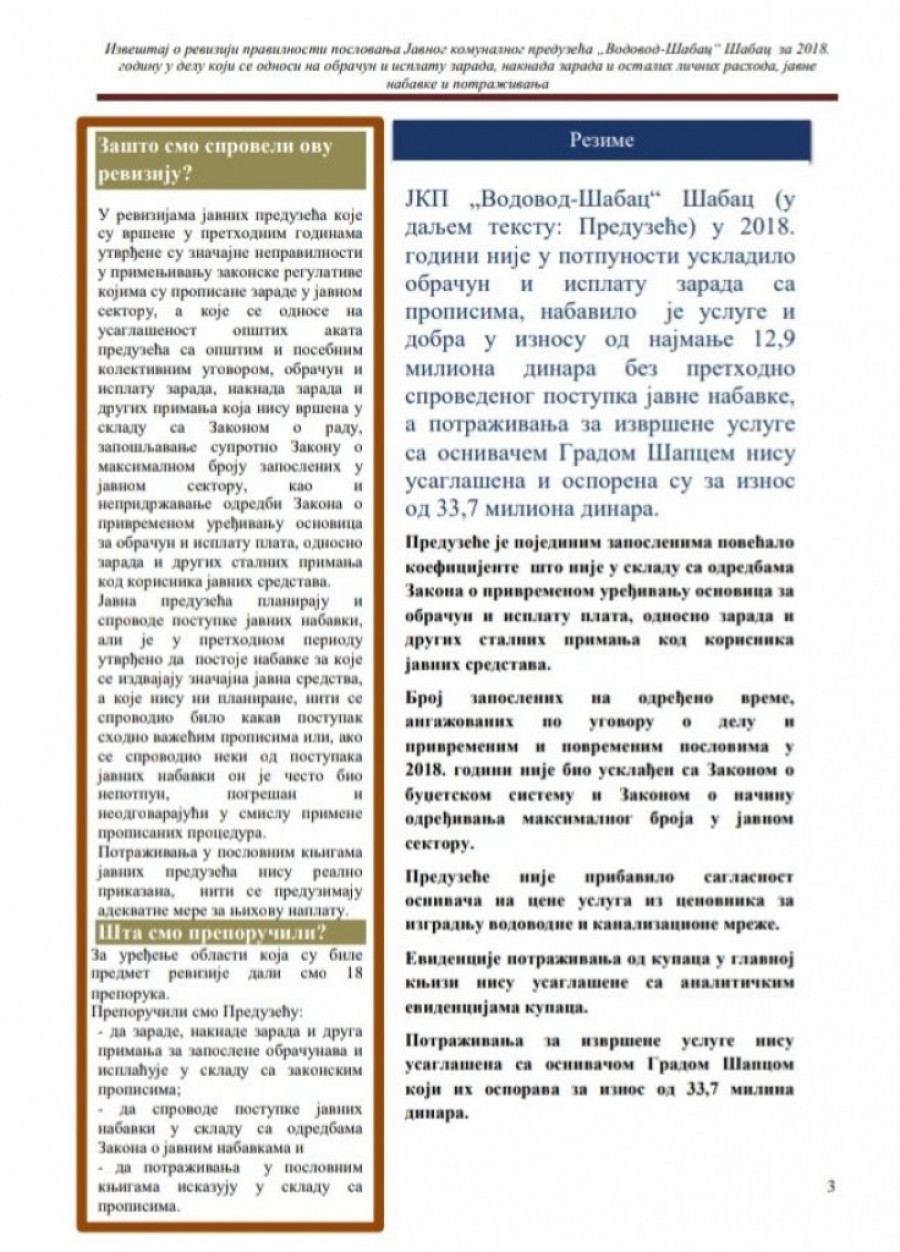 Gde je nestalo na desetine miliona dinara iz šabačkog vodovoda u razno raznim poslovnim mahinacijama Zelenovićevog rukovodstva u ovom javnom preduzeću, samo za jednu 2018.godinu koju je kontrolisao Državni revizor? Nadležno tužilaštvo će sigurno protiv odgovornih podneti Krivične prijave, jer, sudeći po izveštaju DRI – dokaza ima "koliko hoćete", piše Embargo.rs.