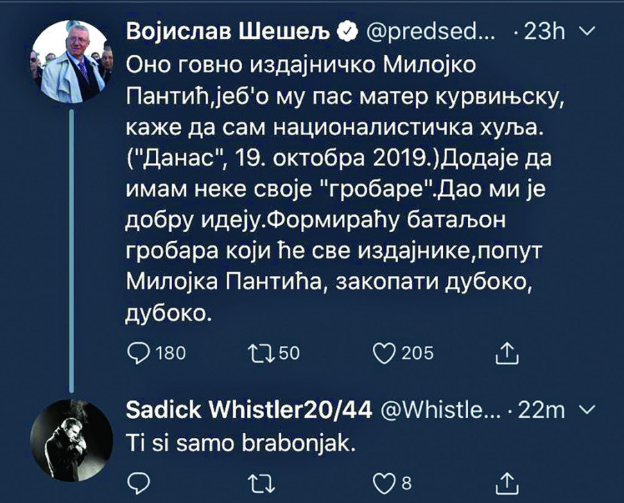 Okršaj Šešelja i PantićaLider radikala Vojislav Šešelj reagovao je na pogrdne reči nekadašnjeg sportskog novinara Milojka Pantića, koji ga je nazvao nacionalističkom huljom. Šešelj je u svom stilu napisao na Tviteru da će formirati bataljon grobara, koji će sve izdajnike, poput Pantića, zakopati duboko. Na to se javio Trifunović, napisavši za Šešelja da je "samo brabonjak". |