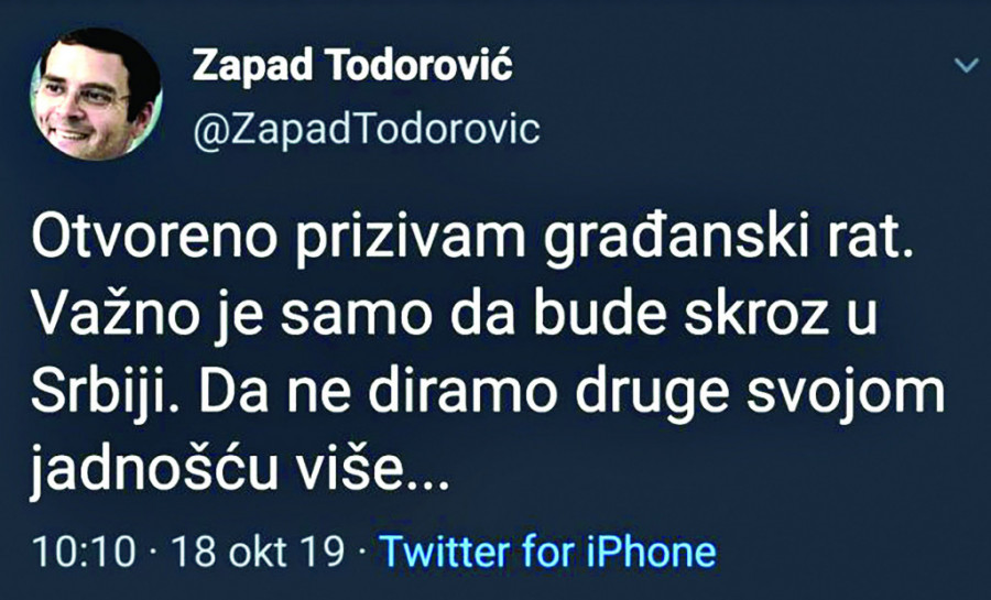 Milinović priziva građanski ratVatreni pristalica opozicije, novinar Daško Milinović, koji je svojevremeno zbog pretnji smrću poslaniku SNS Vladimiru Đukanoviću bio privođen i saslušavan, nastavio je sa izjavama koje pozivaju na mržnju i nasilje. Ovog puta pozvao je Srbe da se međusobno poubijaju. - Otvoreno prizivam građanski rat. Važno je samo da bude skroz u Srbiji. Da ne diramo druge svojom jadnošću više... - napisao je Milinović, koji se na Tviteru predstavlja kao Zapad Todorović. |