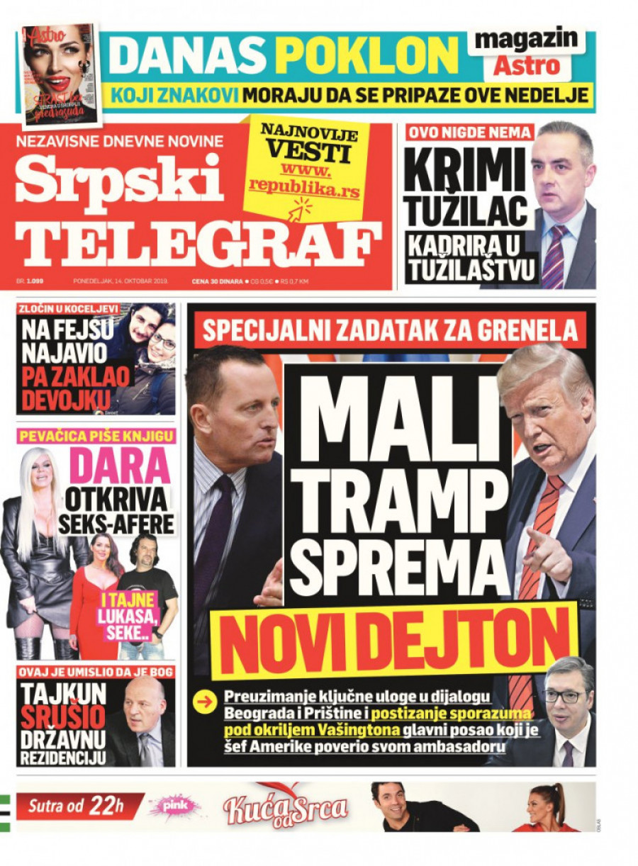 Konferencija na američkom terenuPodsetimo, Srpski telegraf je protekle sedmice objavio upravo ono što sada najavljuje Kostelančik. Tada smo preneli reči sagovornika odlično upućenog u diplomatska dešavanja, da je glavni zadatak koji je šef Bele kuće dao Ričardu Grenelu, ili malom Trampu, kako ga još zovu, da preuzme vodeću ulogu u razgovorima i obe strane dovede za pregovarački sto.