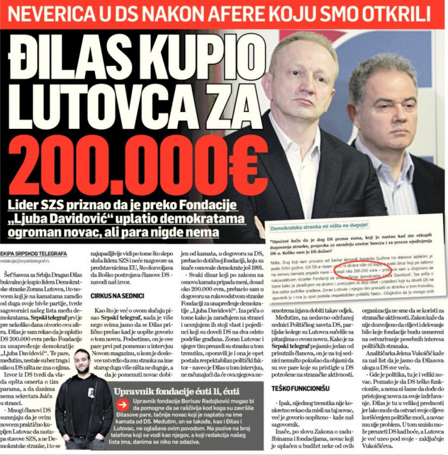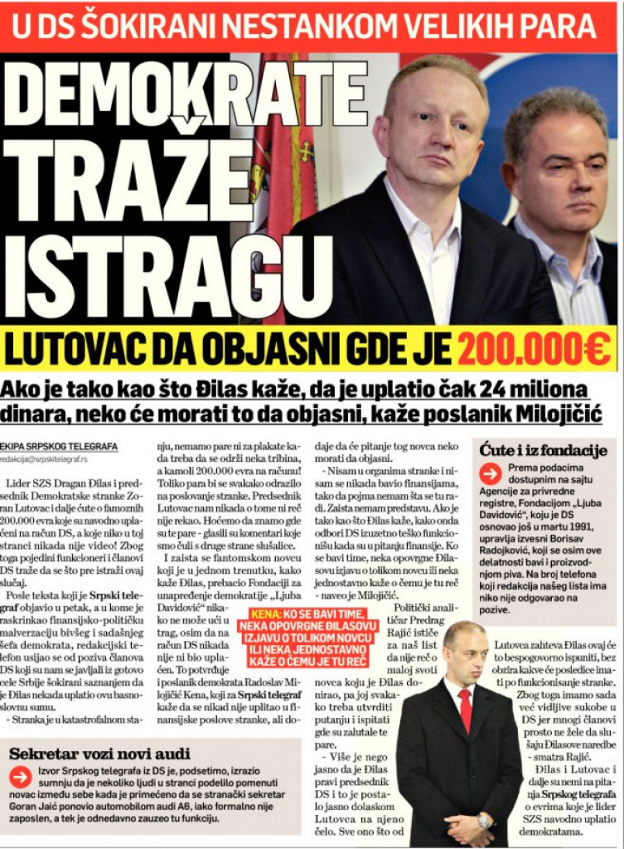 - Đilas je bio jako besan, rekao mu je da ga optužuju da krade od mrtvaca. Zvao ga je da mu kaže da je jako ljut jer ovaj ćuti o tom novcu. Rekao mu je čak da će doći na sednicu Glavnog odbora i pokazati sve novčane transfere ka fondaciji. Lutovac ne sme da potvrdi niti da demantuje ovaj slučaj, pošto nema opravdanja za trošenje para. Uz to, sekretar stranke Goran Jaić se zavukao u mišju rupu i nema ga nigde. Sve je jača sumnja da su oni dobili pare na račun fondacije, a onda ih kroz pranje izvlačili falš fakturama, pa su one prosto nestale - navodi naš izvor iz DS.