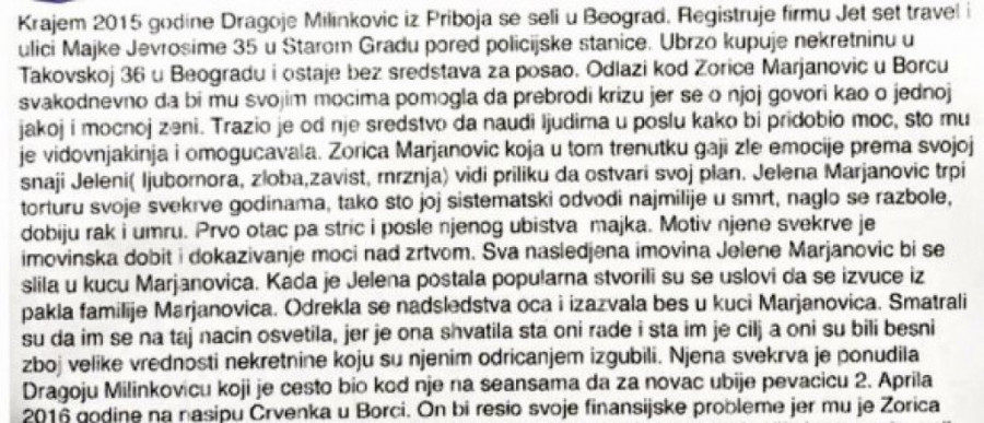 - Kada je Jelena postala popularna, stvorili su se uslovi da se izvuče iz pakla familije Marjanović. Odrekla se nasledstva oca i izazvala bes u kući Marjanovića. Smatrali su da im se na taj način osvetila jer je ona shvatila šta rade i šta im je cilj, a oni su bili besni zbog velike vrednosti nekretnine koju su njenim odricanjem izgubili. Njena svekrva je ponudila Dragoju Milinkoviću, koji je često bio kod nje na seansama, da za novac ubije pevačicu, a oni bi preko male Jane dobili to za šta su se borili skoro pa deceniju. Psihopatski karakter Zorice Marjanović, koja je sve stvorila na prevaru u životu, kulminirao je... - piše dalje u pismu.