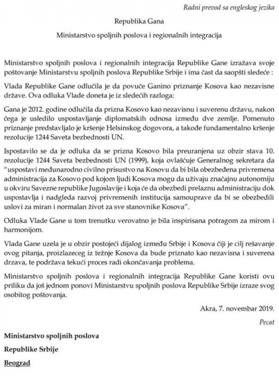 Ministar spoljnih poslova Ivica Dačić saopštio je da je Gana 16. država koja je povukla priznanja tzv. Kosova.