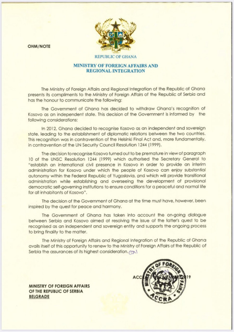Izjava srpskog ministra spoljnih poslova Ivice Dačića da je Gana povukla priznanje nezavisnosti Kosova još jedna je lažna vest, ocenio je savetnik v. d. ministra spoljnih poslova Bedžeta Pacolija Jetljir Ziberaj.