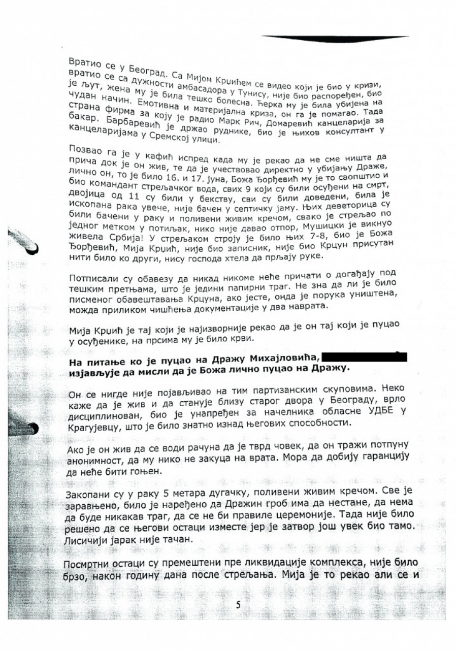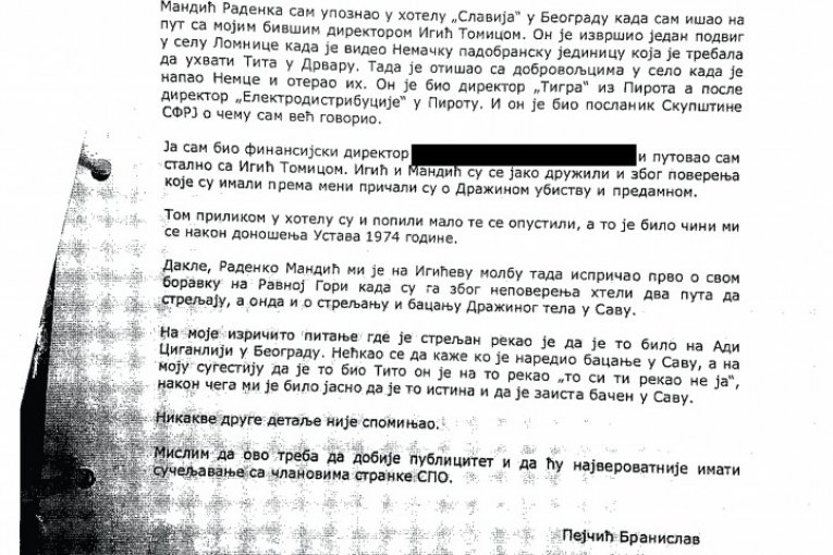 Naš list od juče je počeo da objavljuje dokumente koje su naši novinari pronašli u arhivama tužilaštva, BIA i Vojske. Među tim papirima su i iskazi koji direktno otkrivaju šta se nakon suđenja i pogubljenja dešavalo s Dražinim telom. Prvi iskaz evidentiran je u službenoj belešci o razgovoru sa M. P. iz Pirota (rođen 1937. godine), koji prenosi saznanja iz razgovora sa Radenkom Mandićem (lično učestvovao u Dražinom zarobljavanju, bio u koloni prvi do njega, prerušen u četnika) i Tomicom Igićem. Obojica pomenutih bili su poslanici u Skupštini Srbije te 1974, kada je Pejčić pričao s njima.
