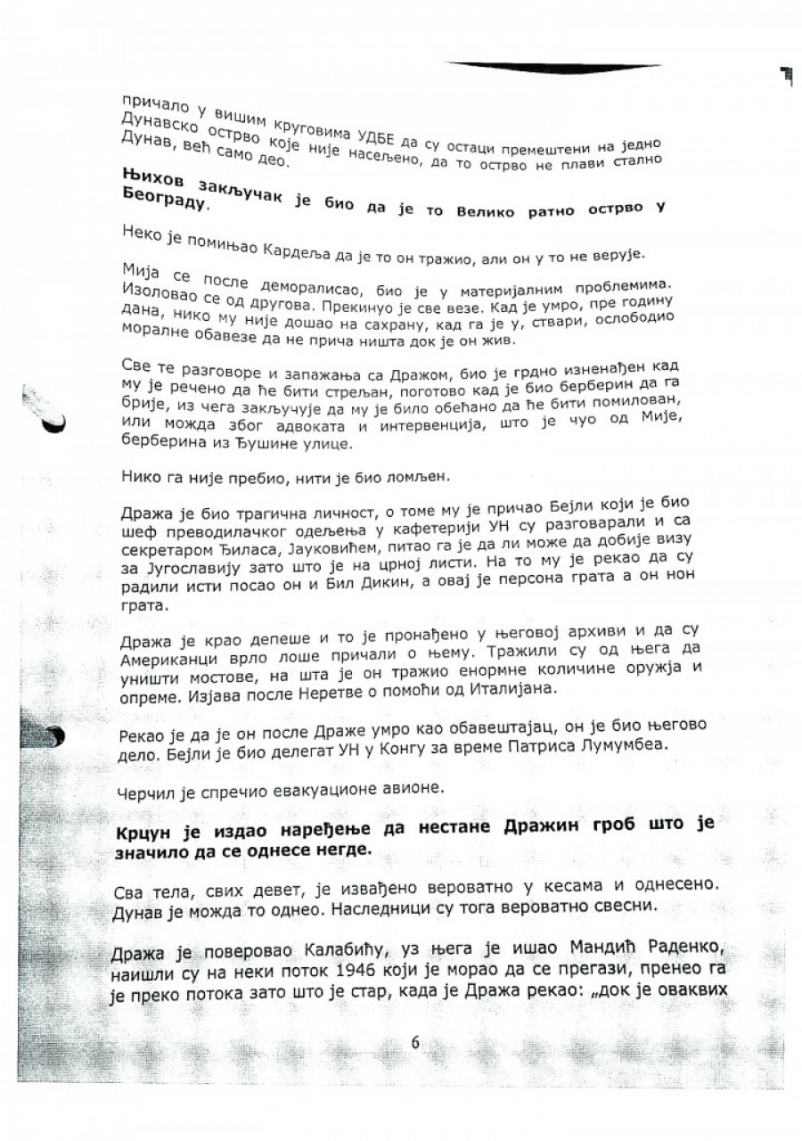 PROŠLO JE VREMES. B. svedoči da su posmrtni ostaci kasnije premešteni: - Nije to bilo brzo, godinu dana posle streljanja. Mija (misli na Miju Krdžića, koji je bio u streljačkom vodu za likvidaciju Draže, prim. aut.) jeste to rekao, ali se i pričalo u višim krugovima UDBA, da su ostaci premešteni na jedno dunavsko ostrvo koje nije naseljeno, da to ostrvo ne plavi stalno Dunav, već samo deo. Njihov zaključak je bio da je to Veliko ratno ostrvo u Beogradu.
