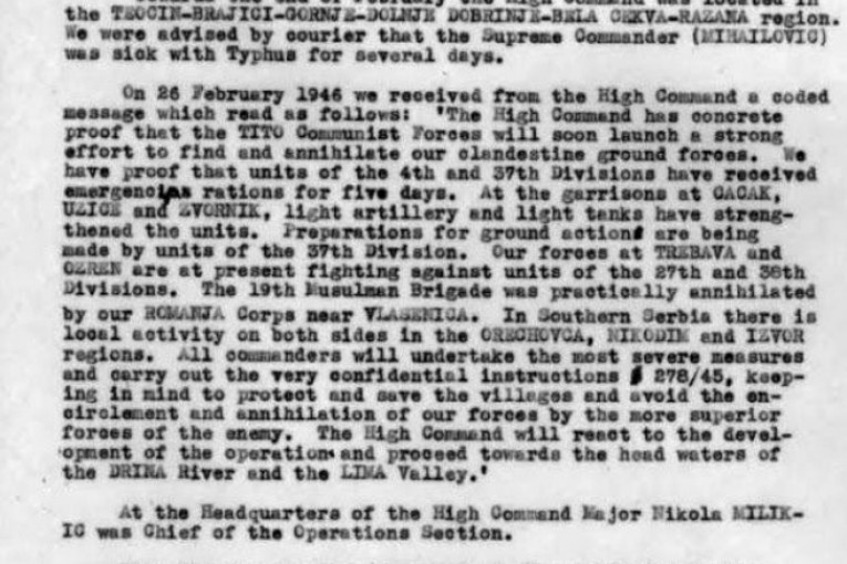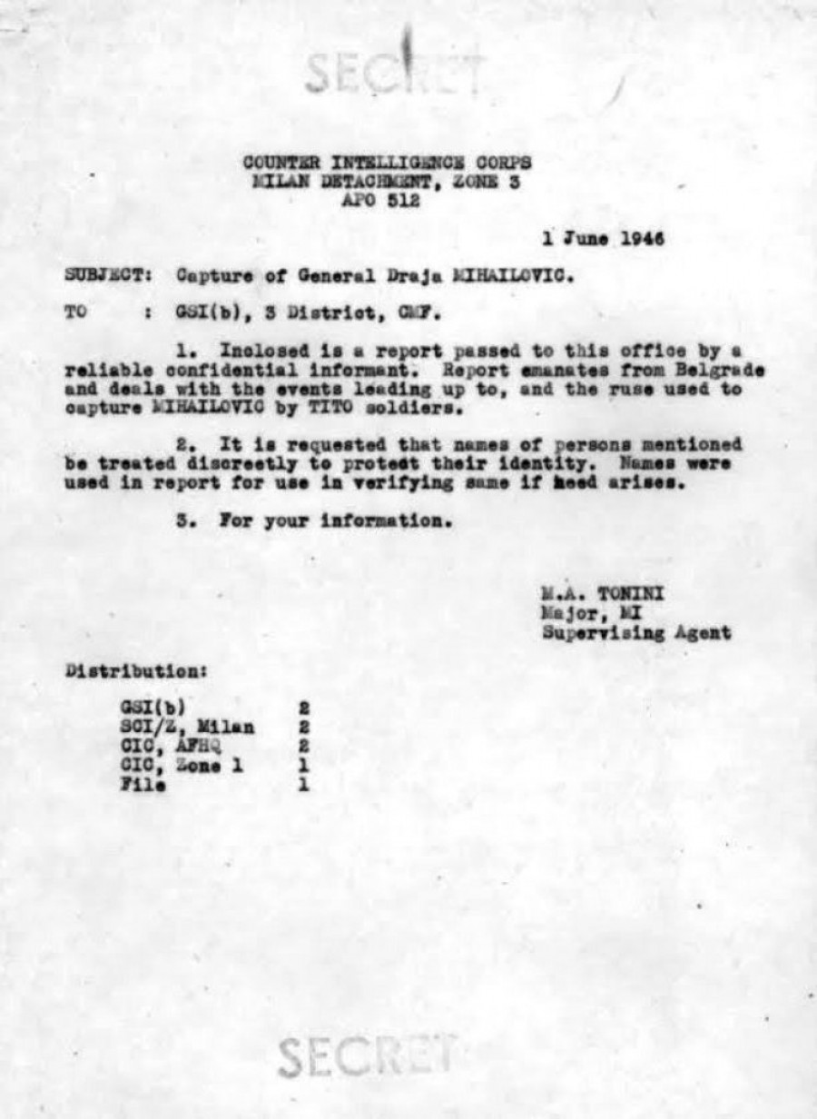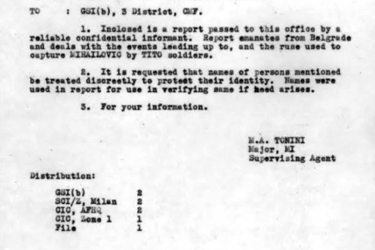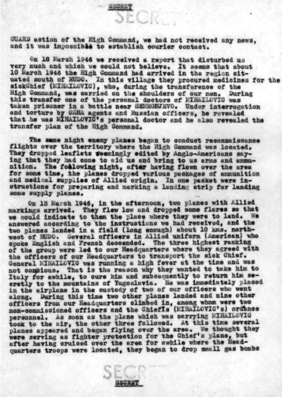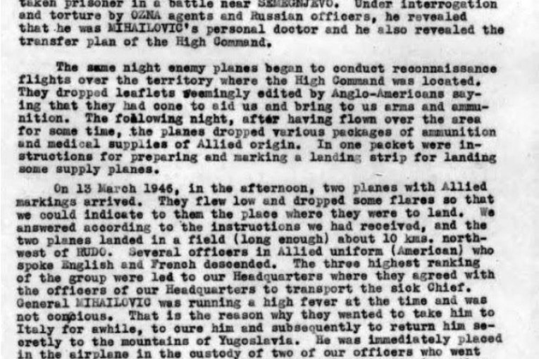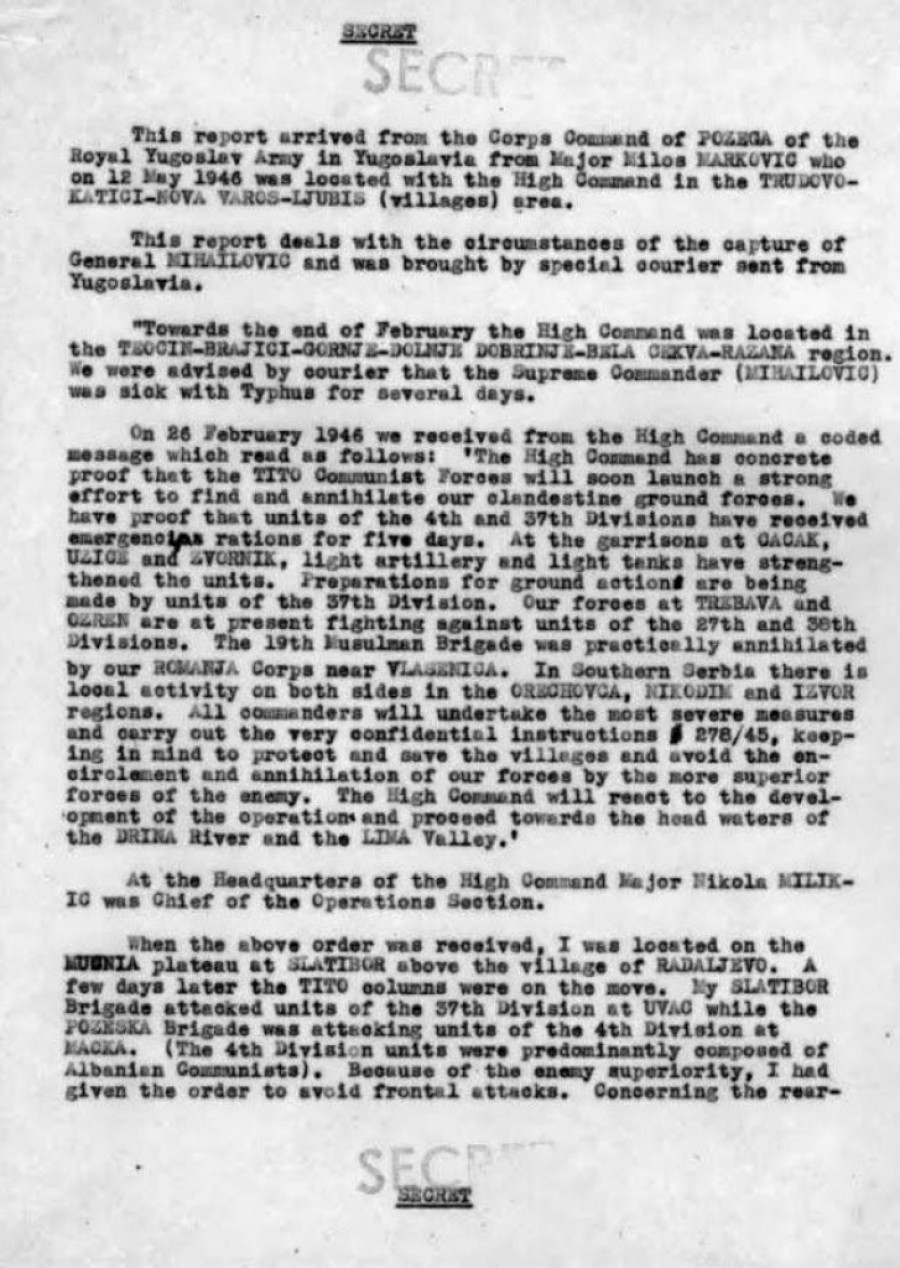 - Ovaj izveštaj stigao je iz komande Požeškog korpusa Kraljevske armije u Jugoslaviji, od majora Miloša Markovića, koji je 12. maja 1946. bio lociran u Vrhovnoj komandi na području Trudovo - Katići - Nova Varoš - Ljubić (sela). Ovaj izveštaj govori o okolnostima zarobljavanja generala Mihailovića, a doneo ga je specijalni kurir poslat iz Jugoslavije - navodi CIA.