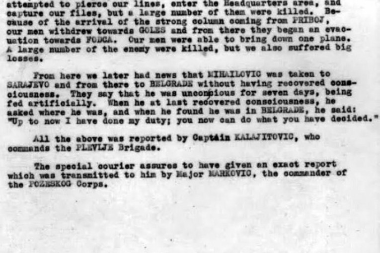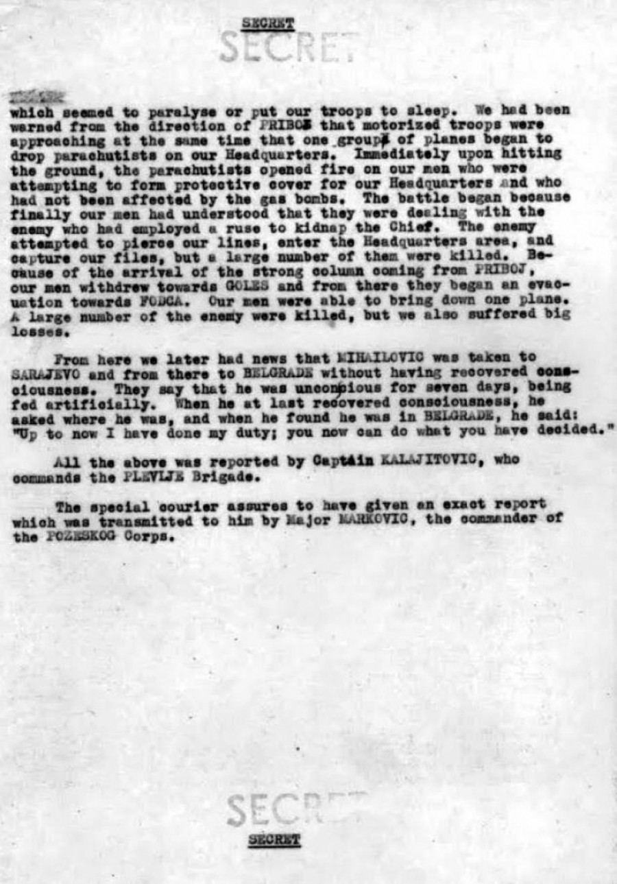 - Počeli su da bacaju male gasne bombe, koje kao da parališu ili uspavljuju naše trupe. Iz pravca Priboja bili smo upozoreni da se motorizovane trupe približavaju u isto vreme kada je jedna grupa aviona počela da ispušta padobrance na naš štab. Odmah po prizemljenju padobranci su otvorili vatru na naše ljude koji su pokušavali da zaštite štab i koji nisu bili pogođeni gasnim bombama. Bitka je započela zato što su konačno naši ljudi shvatili da imaju posla sa neprijateljem koji je upotrebio prevaru za otmicu generala - navodi se u papirima CIA.