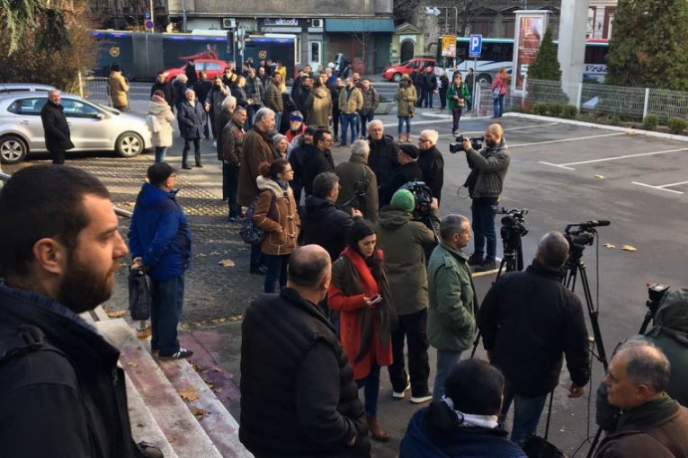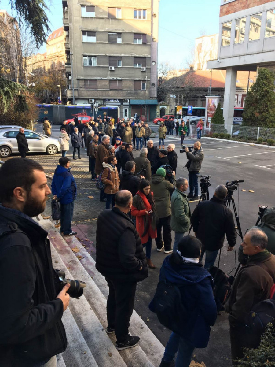 Foto: Srpski telegrafIspred zgrade u Takovskoj ulici u Beogradu nalazi se oko 40 novinara.