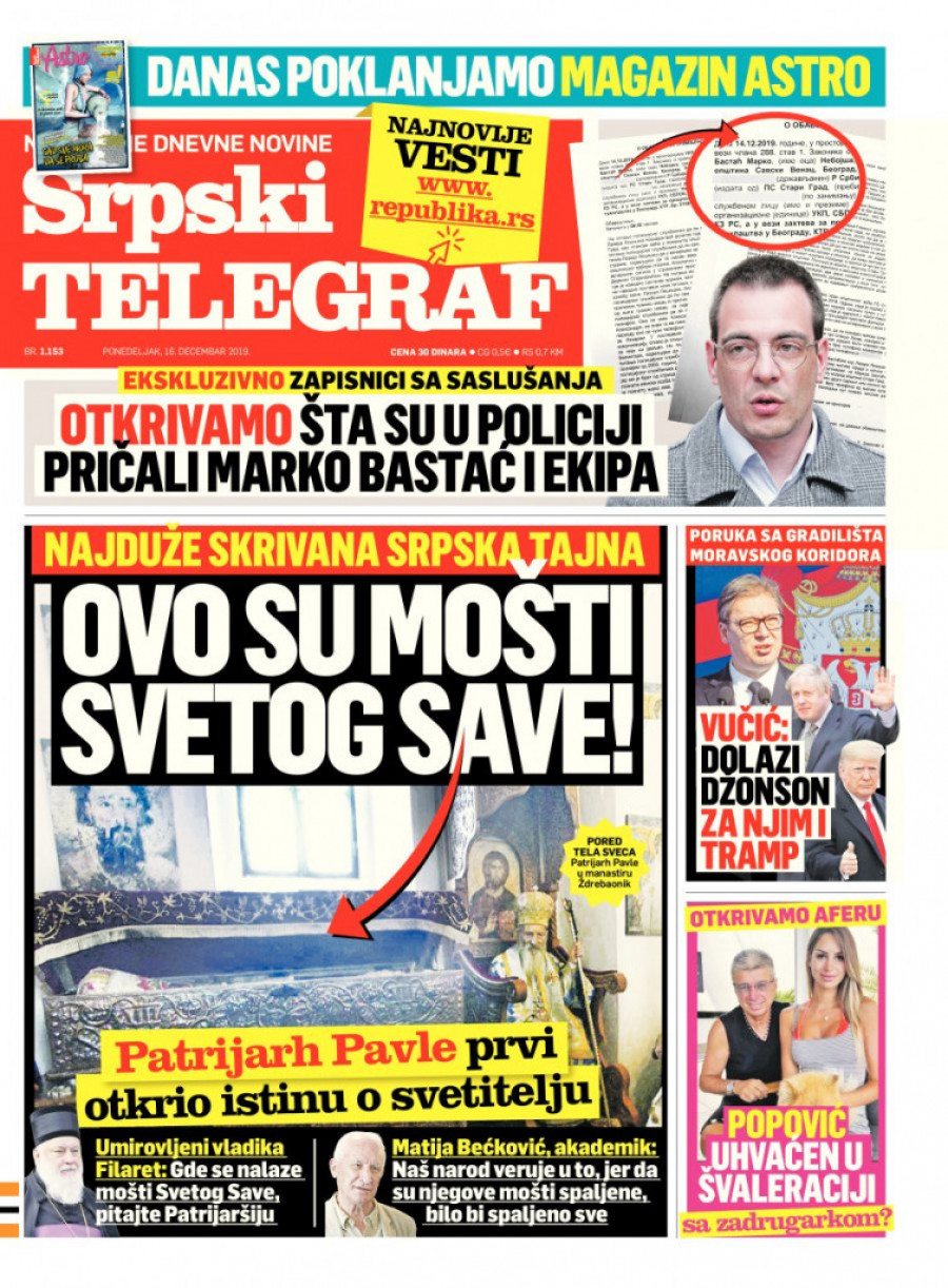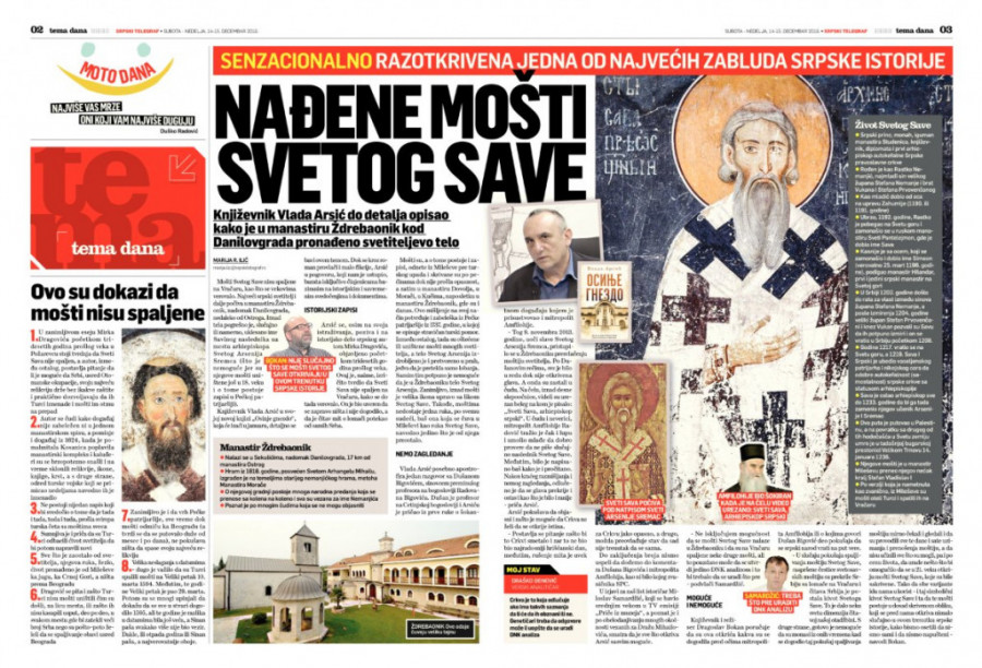 Šta smo objavili u vikend-broju Foto: Srpski telegraf- Mošti Svetog Save nisu spaljene na Vračaru, za to postoje mnogobrojni dokazi - Monasi su mošti sklonili iz Mileševe pre upada Turaka - Mošti su skrivane u pećinama, pa u manastiru Dovolja, u Morači i u Kučima - Konačno su smeštene u manastir Ždrebaonik, kod Danilovgrada, 17 km od Ostroga - Tamo se čuvaju ispod ikone Svetog Save, ali sa natpisom Sveti Arsenije Sremac (naslednik Svetog Save na mestu arhiepiskopa) - Mitropolit Amfilohije lično se uverio da je na lobanji urezano "Sveti Sava, arhiepiskop srpski" - U vrhu SPC odlučeno da se tajna ne otkriva |