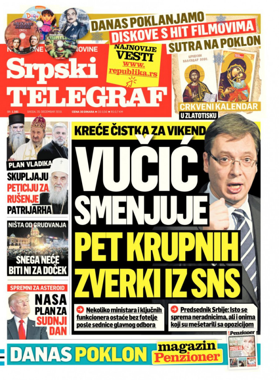 U sutrašnjem izdanju Srpskog telegrafa za 25. decembar čitajte i koga predsednik Aleksandar Vučić planira da smeni iz SNS-a. Saznajte NASA-in plan za sudnji dan. Osim toga, na žalost, nećemo imati snega za doček. O svemu ovome čitajte i na portalu Republika.