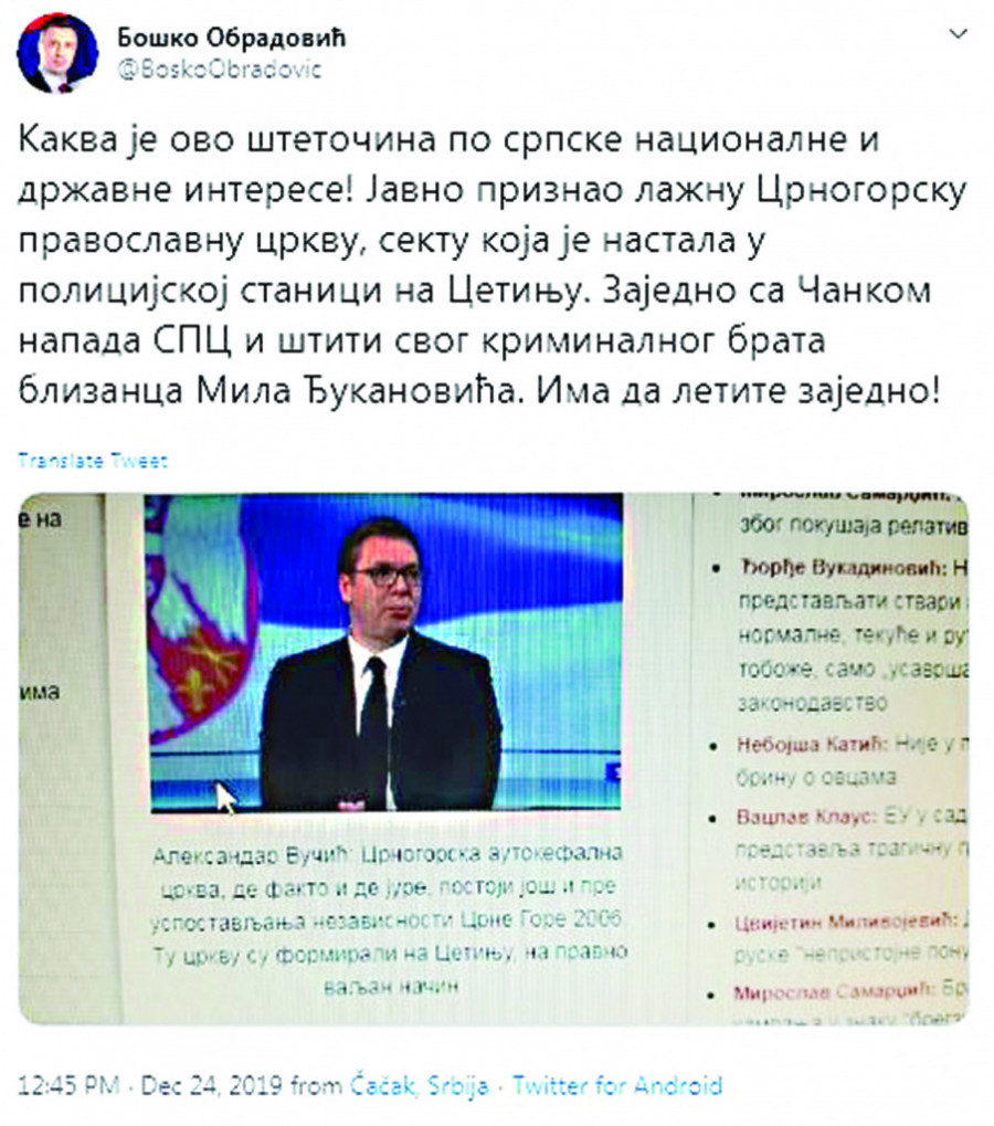 Foto: twitter.com/BoskoObradovicObradović napao Vučića zbog CPCPortali bliski vlasti u Crnoj Gori izvrnuli su reči predsednika Aleksandra Vučića kako bi se u tamošnjoj javnosti stekao utisak da on podržava tzv. crnogorsku pravoslavnu crkvu. Oni su izvukli iz konteksta njegov citat u kome se kaže da CPC defakto i dejure postoji i pre uspostavljanja nezavisnosti 2006, što je jedva dočekao lider Dveri Boško Obradović da opljune predsednika na Tviteru. - Kakva je ovo štetočina po srpske nacionalne i državne interese! Javno priznao lažnu crnogorsku pravoslavnu crkvu, sektu koja je nastala u policijskoj stanici na Cetinju. Zajedno sa Čankom napada SPC i štiti svog kriminalnog brata blizanca Mila Ðukanovića. Ima da letite zajedno - tvitnuo je Obradović. |
