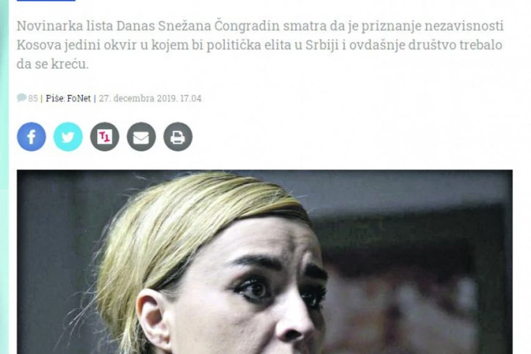 Novinarka lista Danas Snežana Čongradin smatra da je priznanje nezavisnosti Kosova jedini okvir u kojem bi politička elita u Srbiji i ovdašnje društvo trebalo da se kreću.