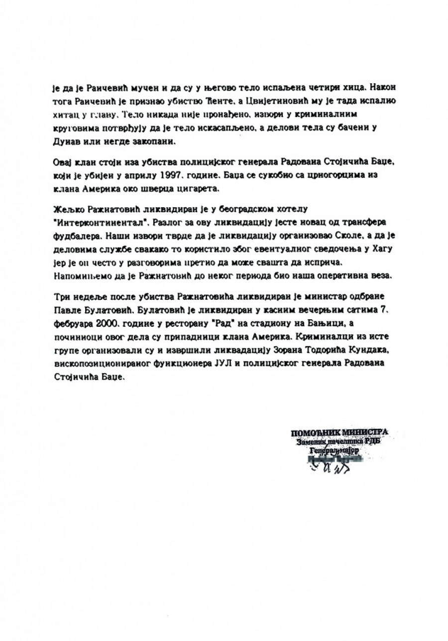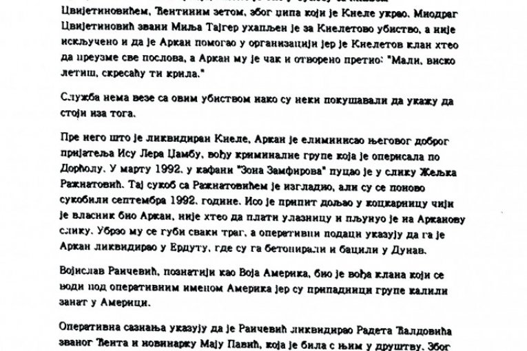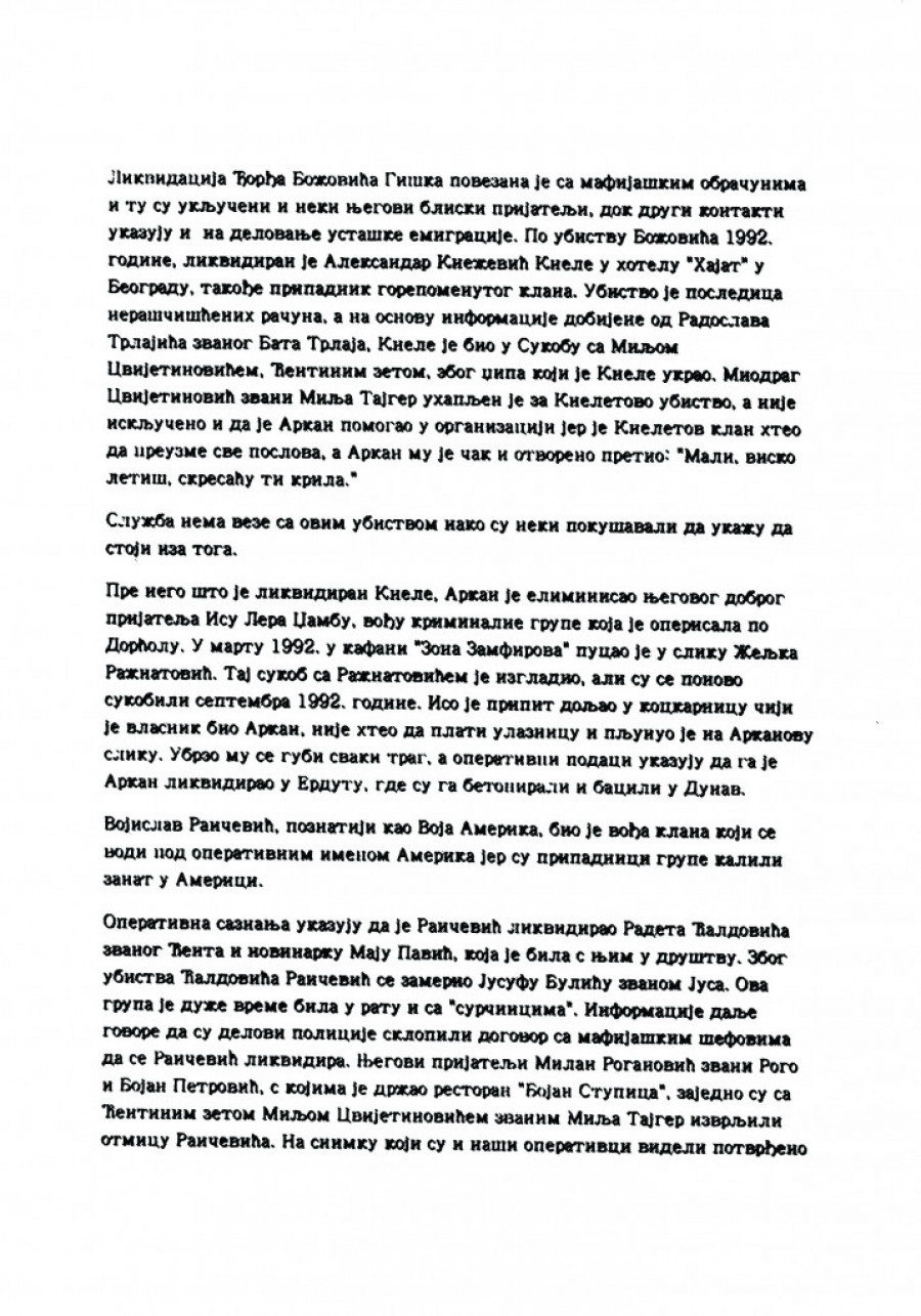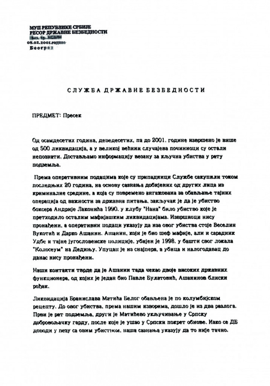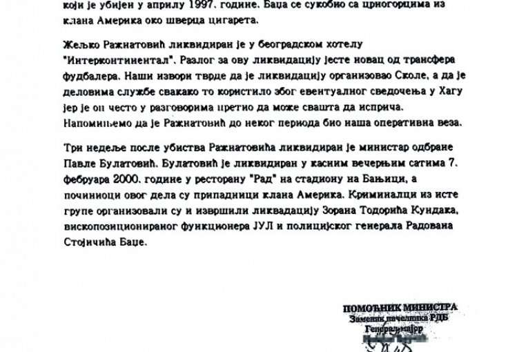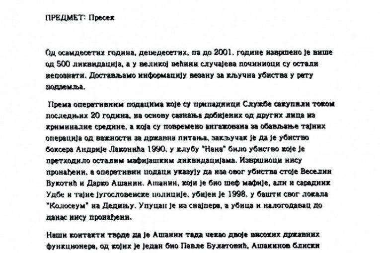 U belešci koju objavljujemo jasno se vidi da je služba znala da neki pripadnici DB sarađuju sa mafijašima, ali i da se uticajni političari poput ministra odbrane i tajno sastaju s njima. U dokumentu se navode likvidacije koje su se desile osamdesetih, ali se ubistvo boksera Andrije Lakonića 1990. u klubu "Nana" navodi kao ubistvo posle kojeg se u mafijaške obračune uplela i politika.