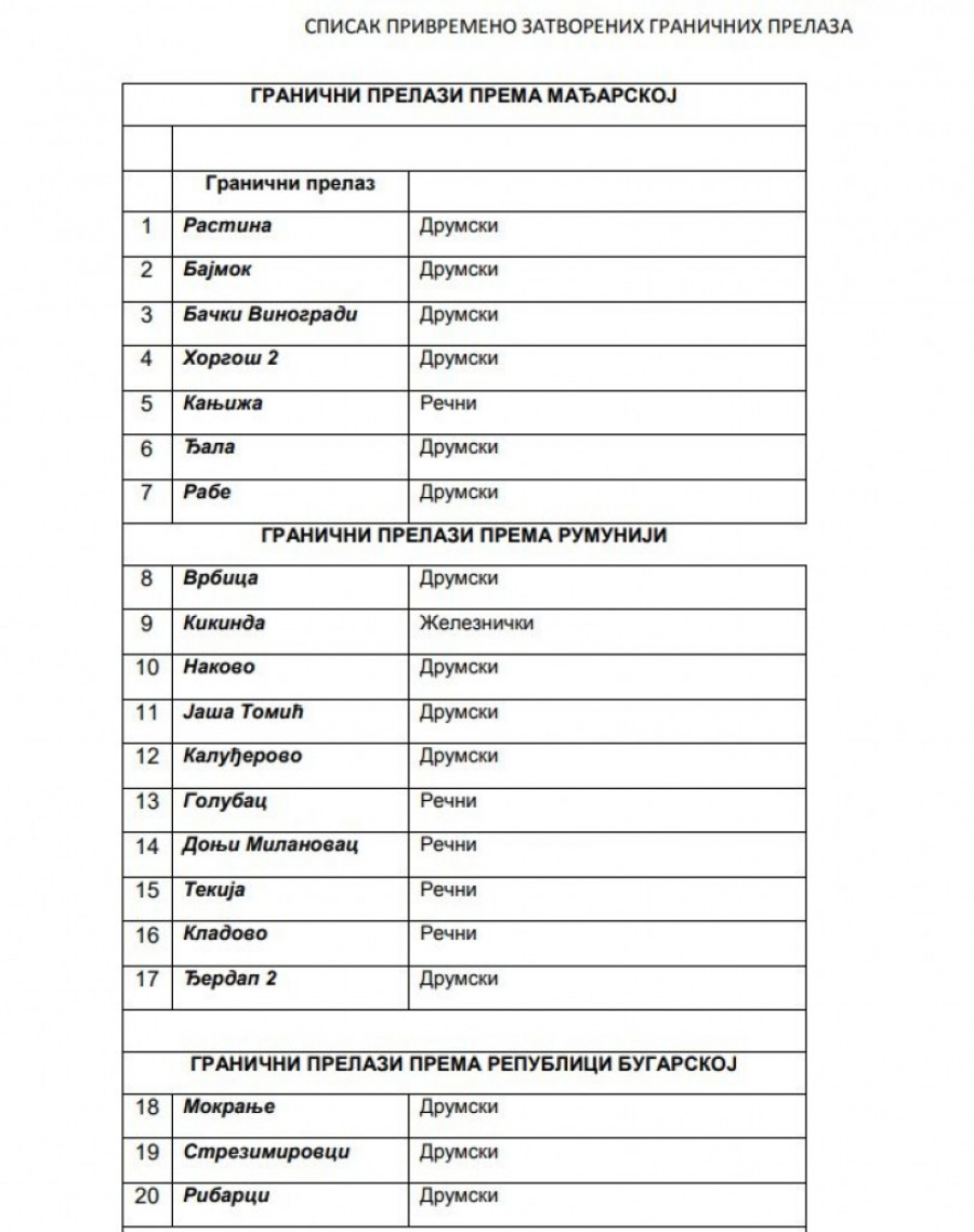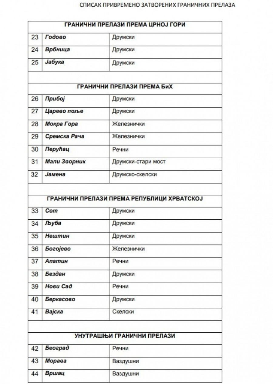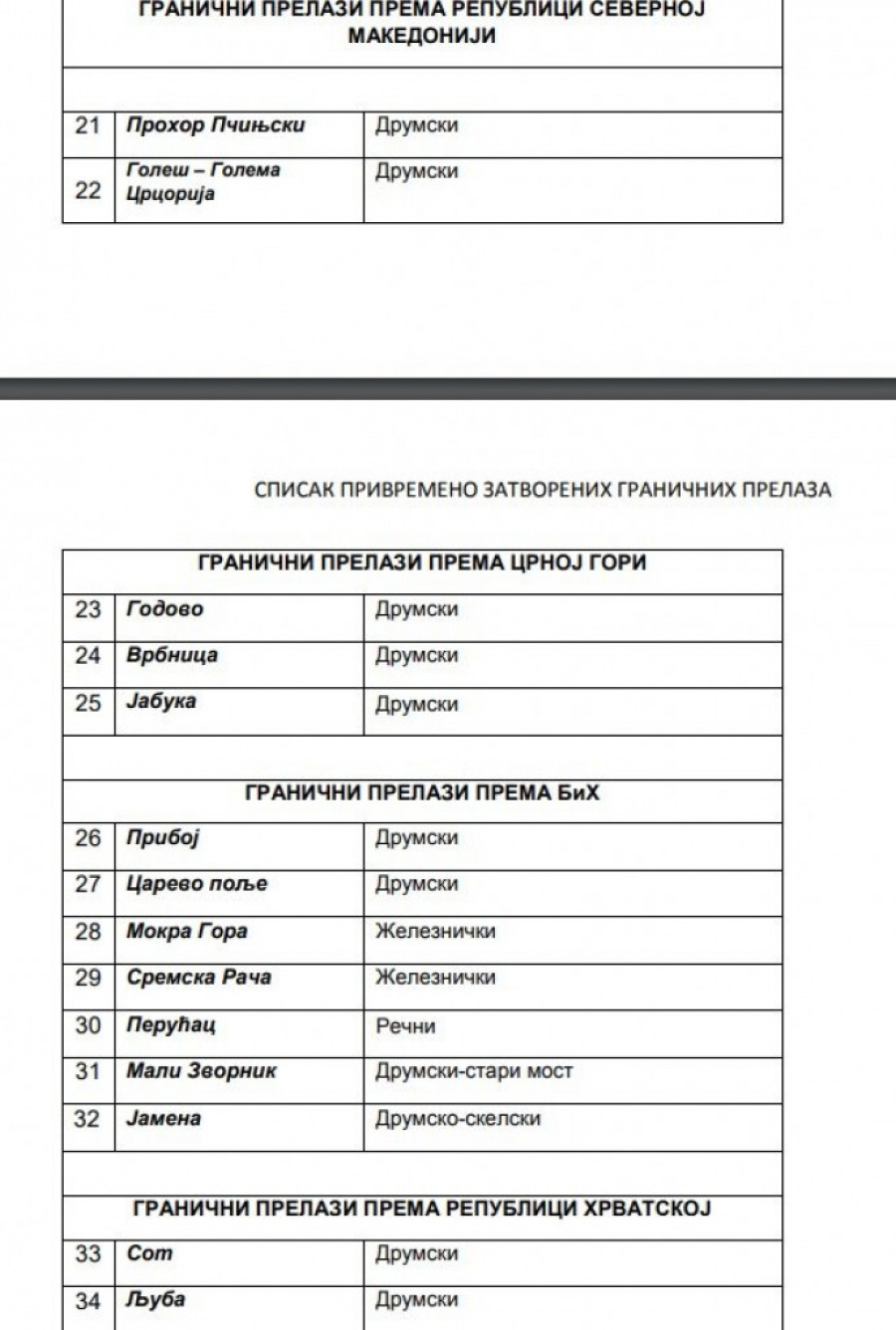 Prema Severnoj Makedoniji zatvoreni su prelazi - Prohor Pčinjski i Goleš - Golema Crcorija, prema Crnoj Gori - Godovo, Vrbnica i Jabuka, prema BIH - Priboj, Carevo polje, Mokra Gora, Sremska Rača, Perućac, Mali Zvornik-stari most i Jamena - skelski prevoz.